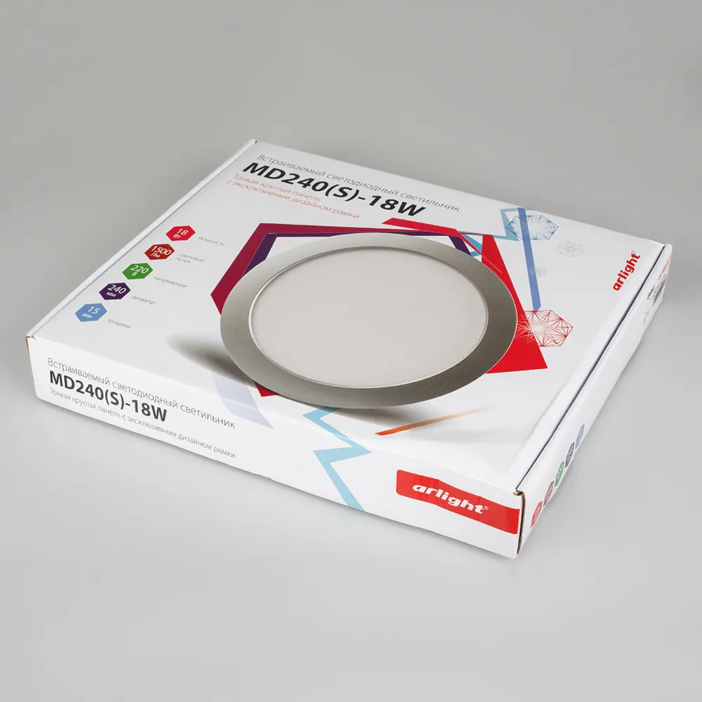 Тонкая круглая панель с эксклюзивным дизайном рамки. Цвет корпуса - серебро. Мощность 18Вт. Цвет свечения ДНЕВНОЙ БЕЛЫЙ 4000K. Световой поток 1260-1500 лм. Угол 120°. Размер Ф240 x 15мм, установка в отверстие 230мм. Питание от сети 220VAC, драйвер в комплекте (DC870mA, 18-22V).