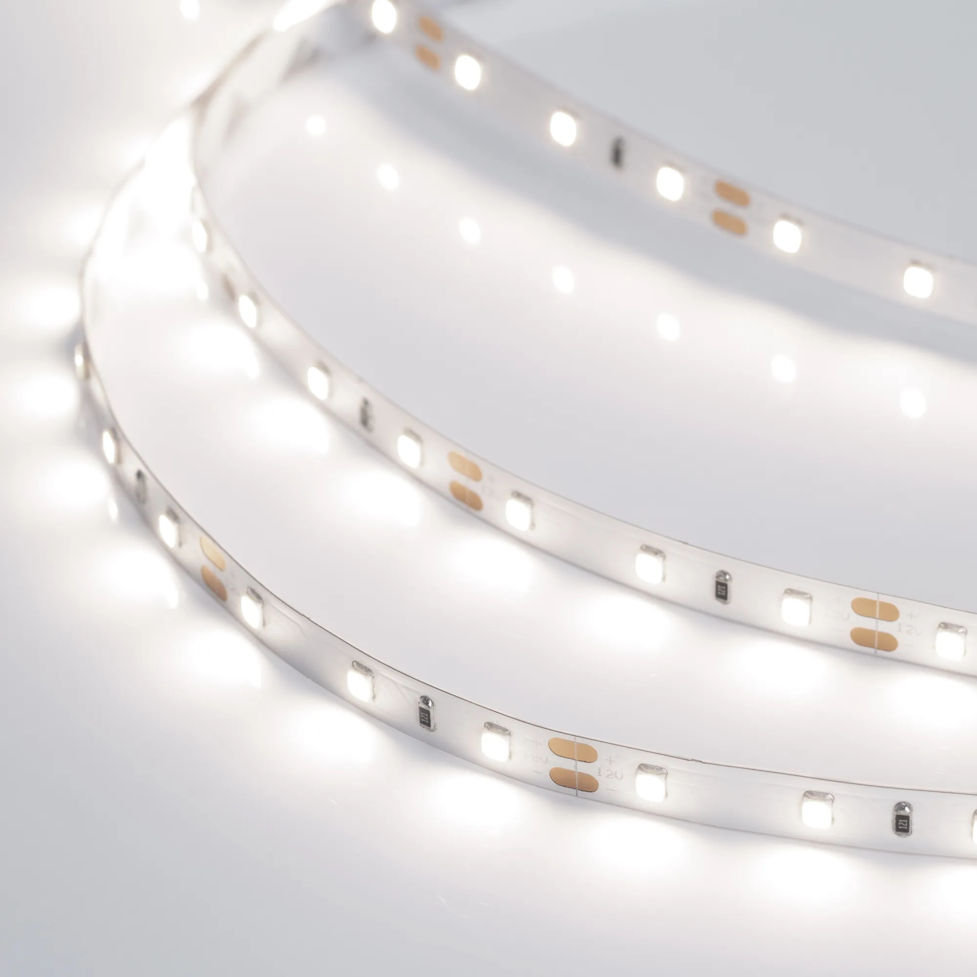 Гибкая лента PRO, светодиоды smd 2835, 60шт/м (300шт на 5м), белая плата 8мм, скотч 3М. Цвет ДНЕВНОЙ 3800-4200K. Питание 12V, мощность 7.2 Вт/м (36 Вт на 5м), угол 120°, цветопередача CRI>85. Размеры 5000х8x1.5мм. Мин.отрезок 50мм, 3 шт светодиода. Пакет 5м. Цена за 1м.