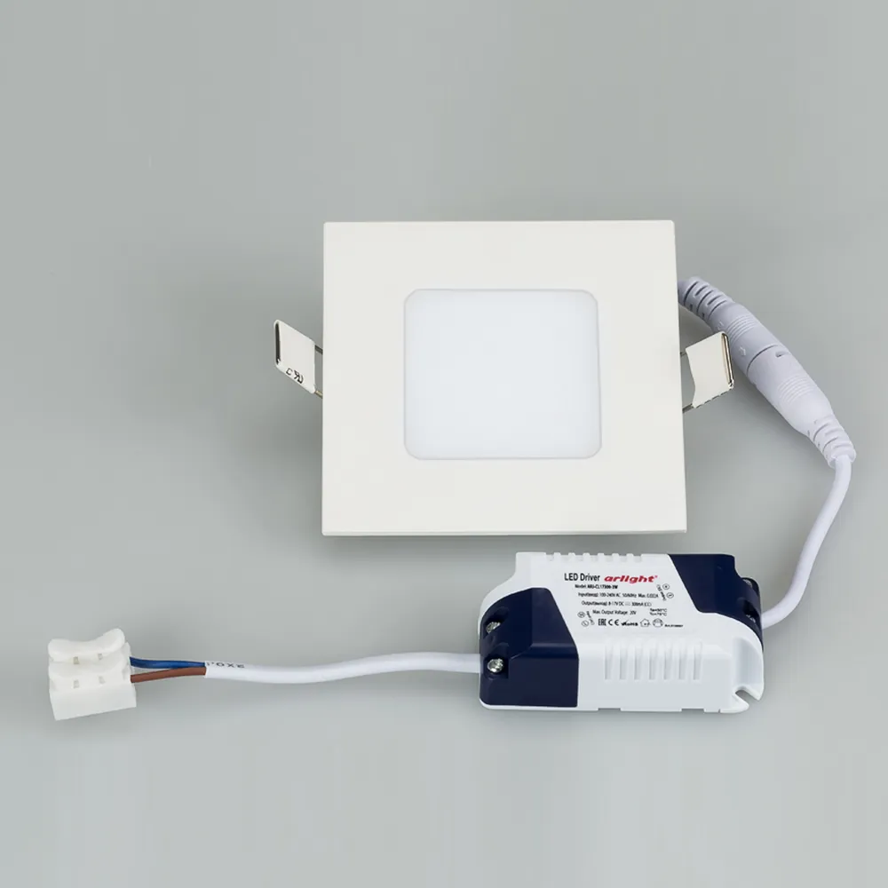 Тонкая панель 3Вт / БЕЛЫЙ 6000K / 230лм / 120°. Размер 90 х 90 x 13мм (в отверстие 70х70 мм). Корпус квадратный, белый. Питание 100-240 VAC, драйвер в комлекте (300mA, 8-17V). Не диммируется.