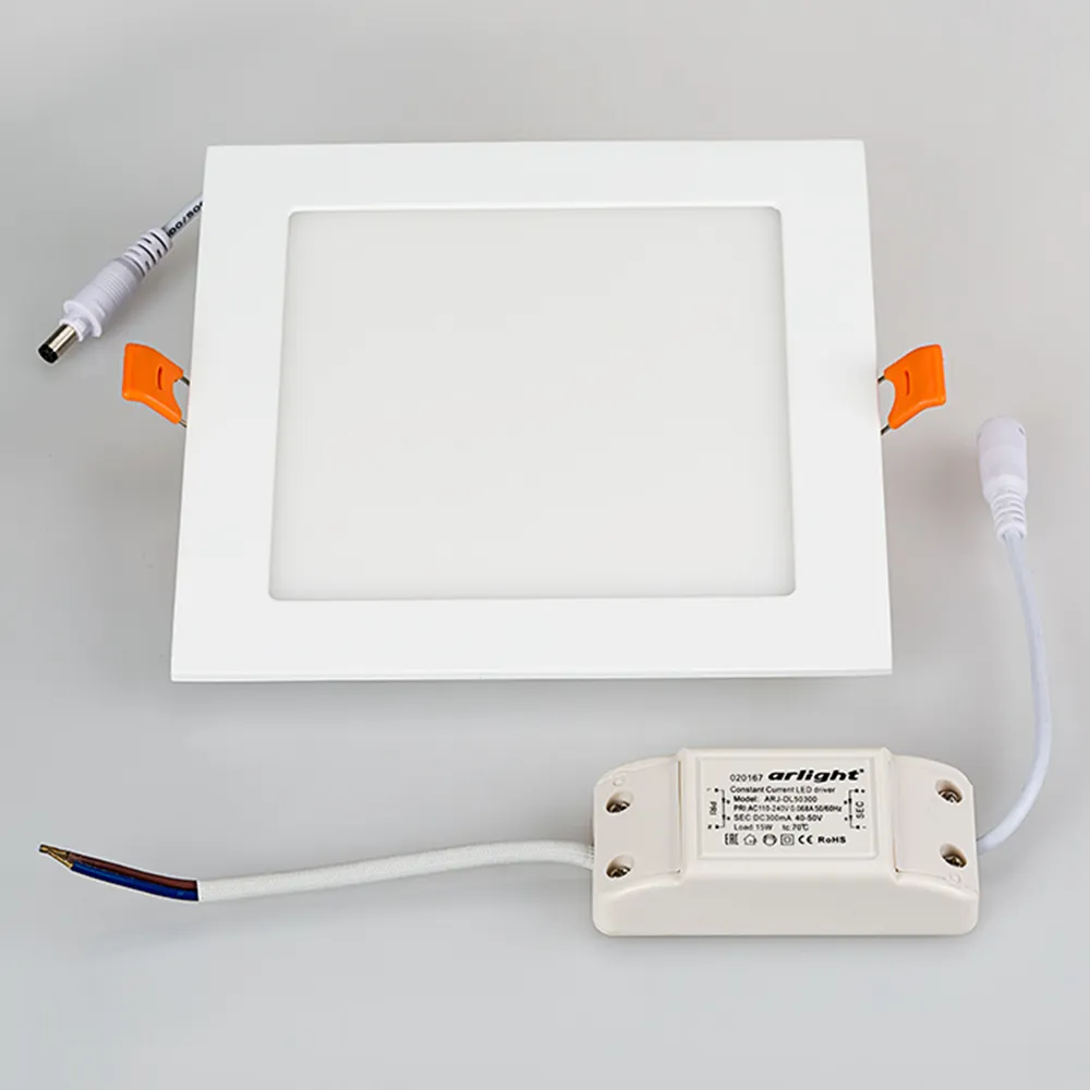 Поставка под заказ от 100 шт. Тонкая панель 15Вт, белый квадратный корпус. Цвет БЕЛЫЙ 6000K, св.поток 1125-1200лм, CRI(Ra)>80, угол 120°. Размер 172x172мм, высота корпуса 13мм, установка в отверстие 160x160мм. Питание AC 180-240V, 15Вт, драйвер в комплекте (DC300mA, 40-50V).