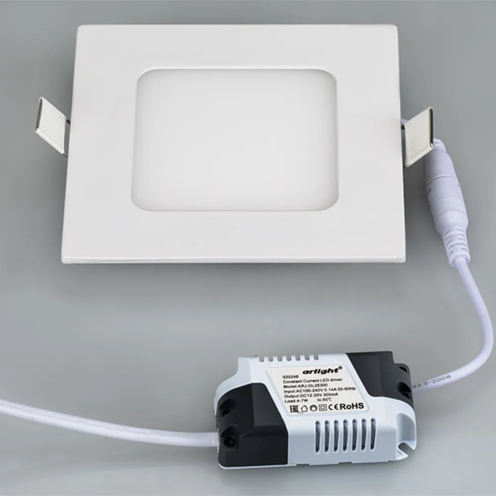 Тонкая панель 6Вт, белый квадратный корпус. Цвет ТЕПЛЫЙ БЕЛЫЙ 3000K, св.поток 460лм, CRI(Ra)>80, угол 110°. Размер 120x120x25 мм, установка в отверстие 100x100 мм. Питание AC 100-240V, 6Вт, драйвер в комплекте (DC300mA, 12-25V).