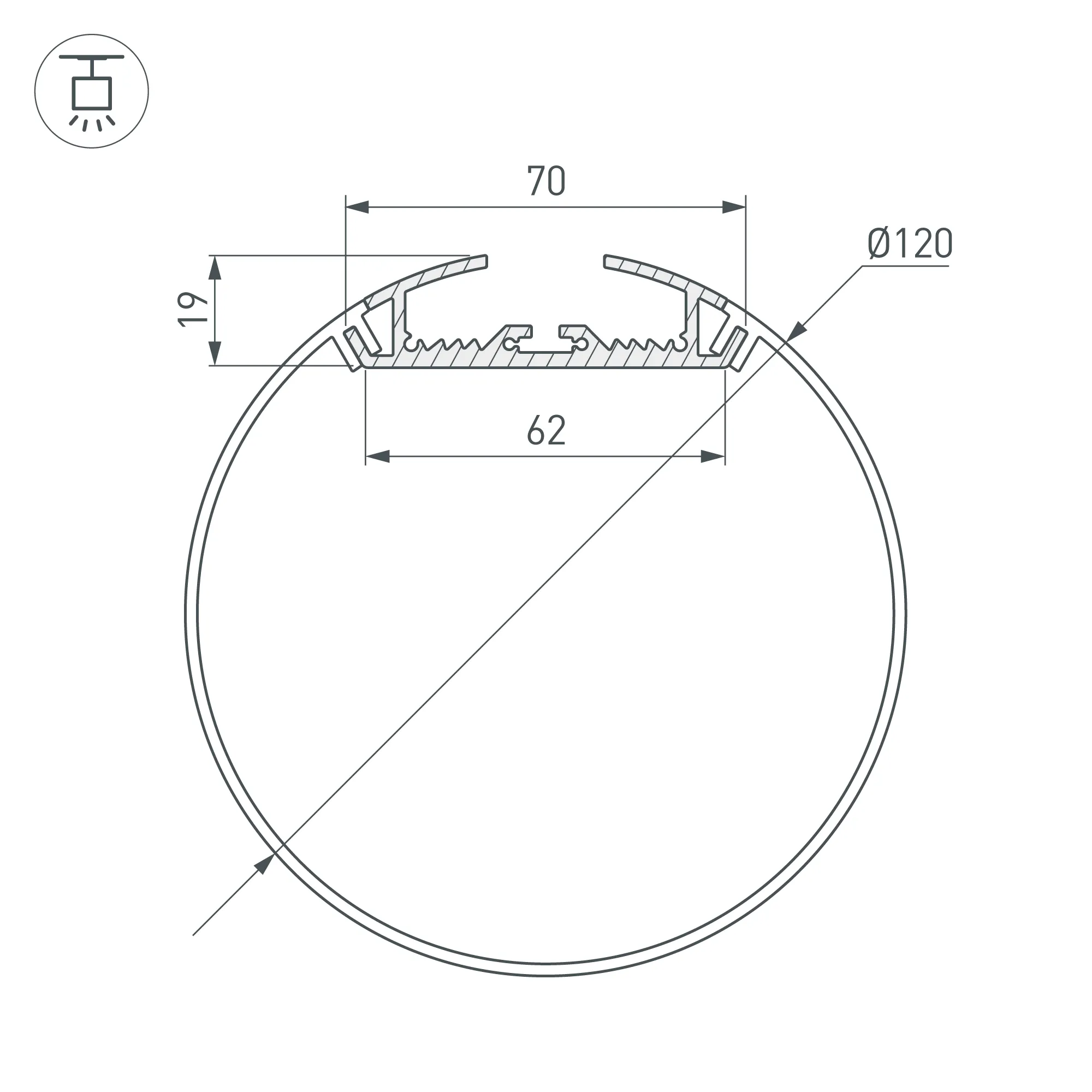 Комплект с экраном. Алюминиевый анодированный профиль для светодиодных лент и линеек. Габаритные размеры профиля (L×W×H): 2500x70x19 мм. Габаритные размеры профиля с экраном (L×D): 2500xD120 мм. Ширина площадки для ленты 62 мм. Аксессуары приобретаются отдельно.