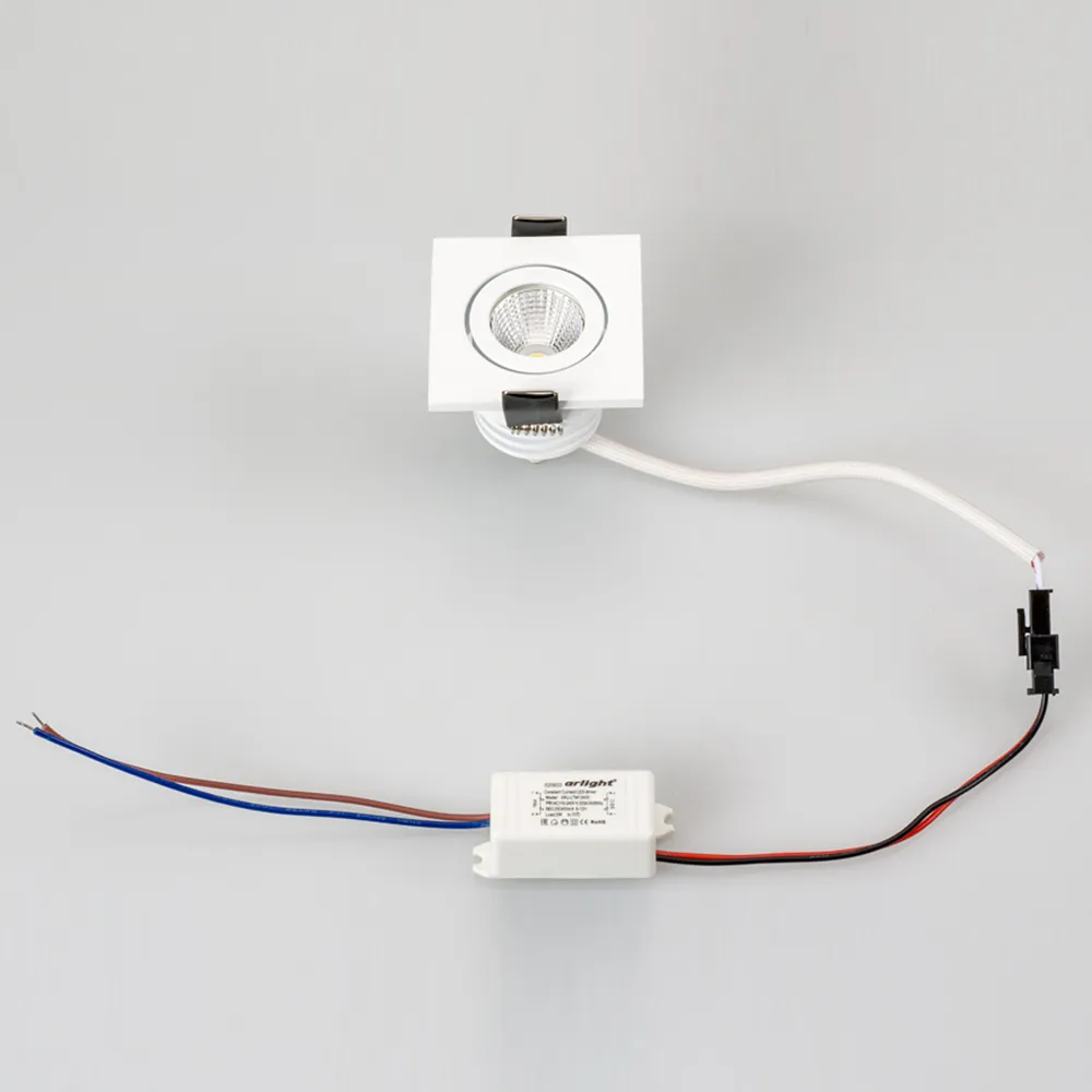 Врезной квадратный мебельный светильник 5Вт, корпус белый алюминий. Цвет ДНЕВНОЙ БЕЛЫЙ 4000K. Светодиод 1х5W Bridgelux. CRI>80, Св.поток 350-400лм, наклоняемая ось, угол 25°. Питание 180-240VAC, 5Вт, 400mA 11-13V, драйвер в комплекте. Размеры 50x50x50 мм, врезное отверстие d42 мм.