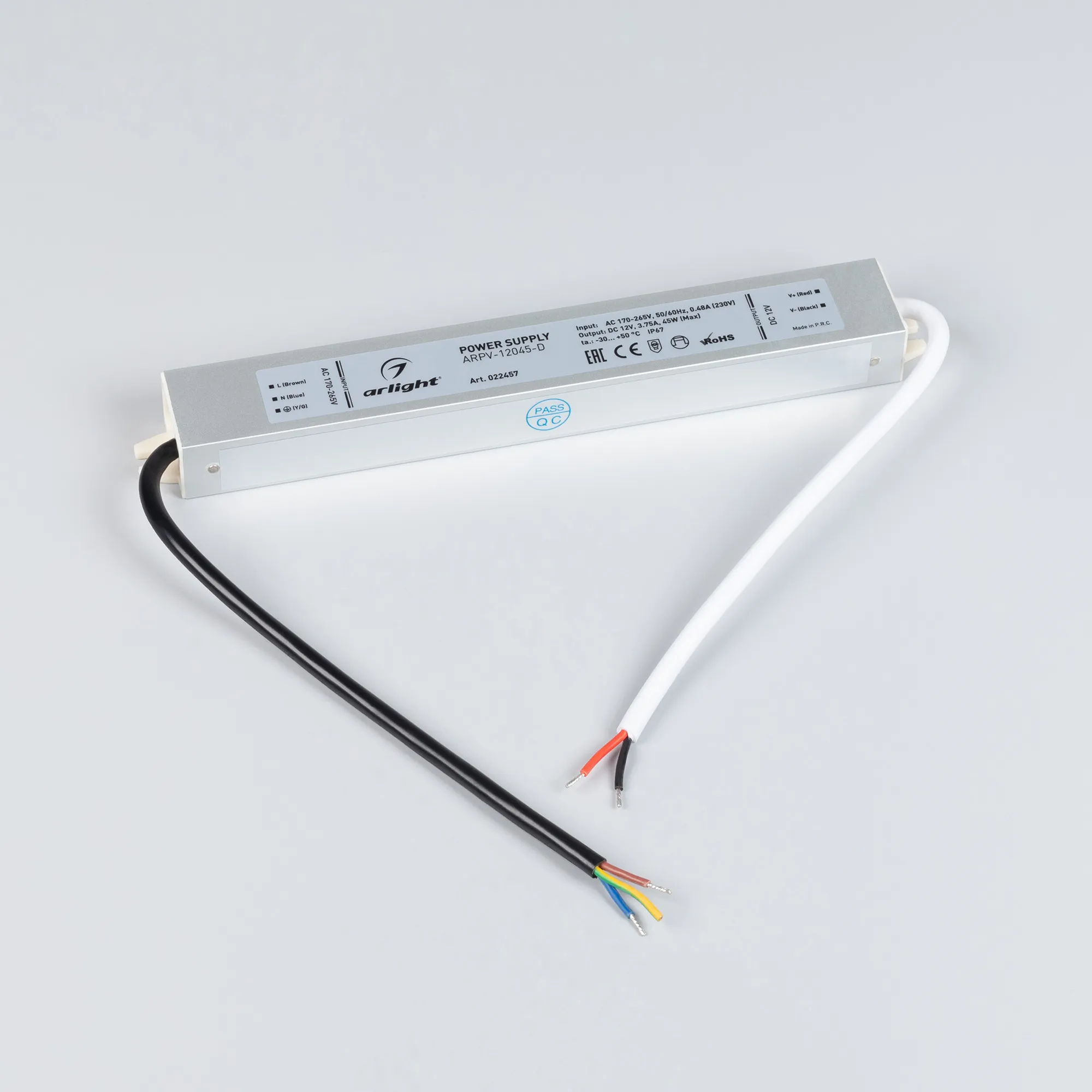 Источник напряжения с гальванической развязкой для светодиодных изделий. Входное напряжение 170-265 VAC. Выходные параметры: 12 В, 3,75 А, 45 Вт. Герметичный алюминиевый корпус IP 67. Рабочая температура -30…+50C⁰. Габаритные размеры длина 217 мм, ширина 30 мм, высота 20 мм. Гарантийный срок 3 года.