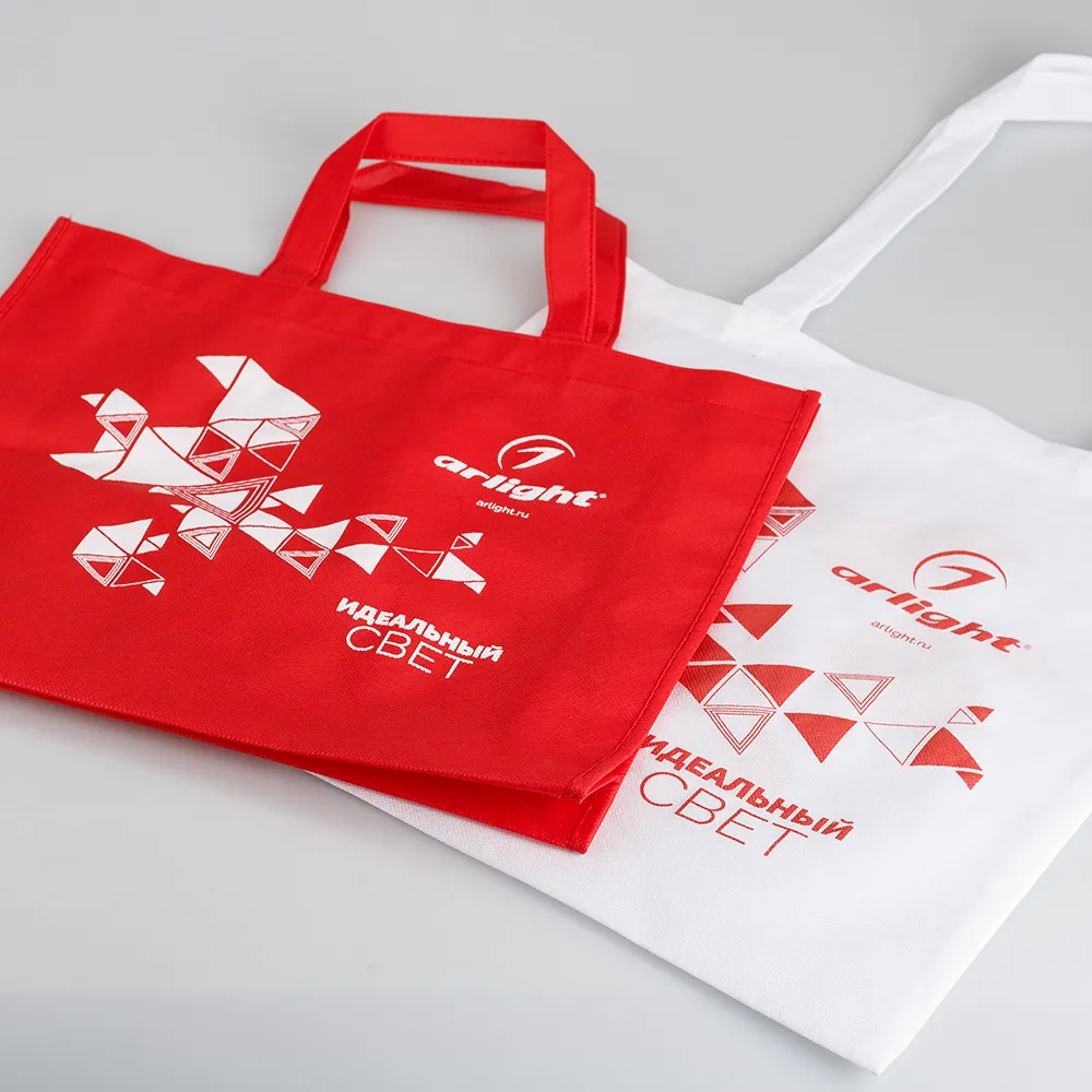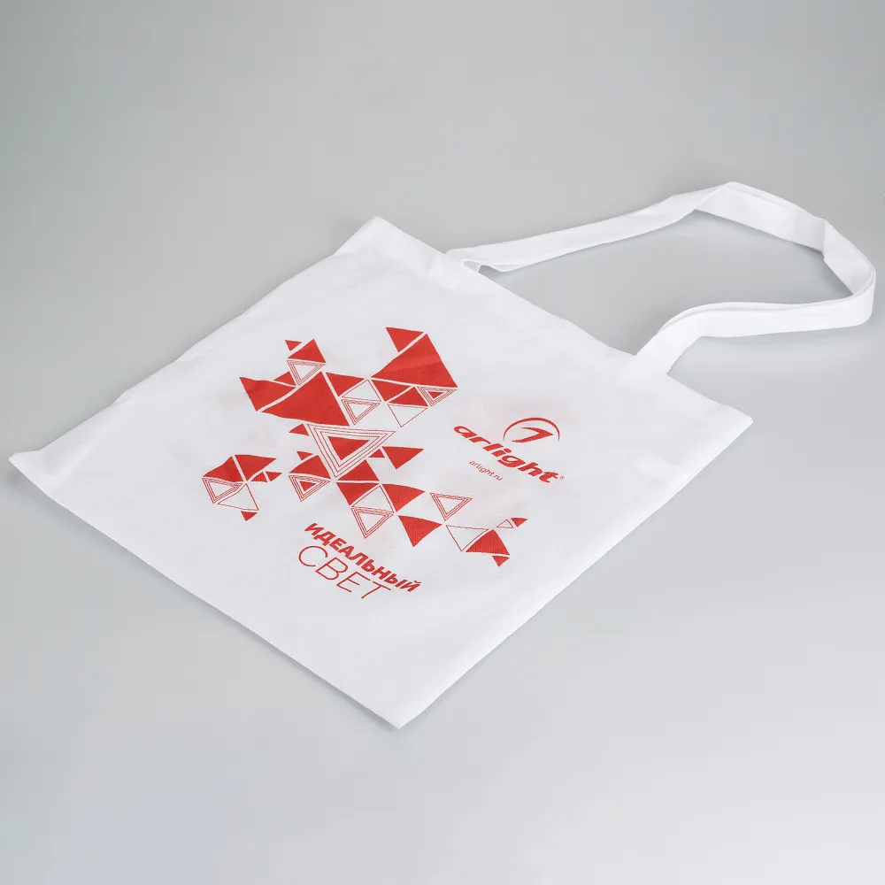 Сумка белая 38*38см, длинные ручки 29см. Персонализация: двухстороннее нанесение, русский+английский (логотип arlight, фирменный элемент "а", сайт www.arlight.ru). Материал - нетканый полипропилен. Для грузов до 10кг.