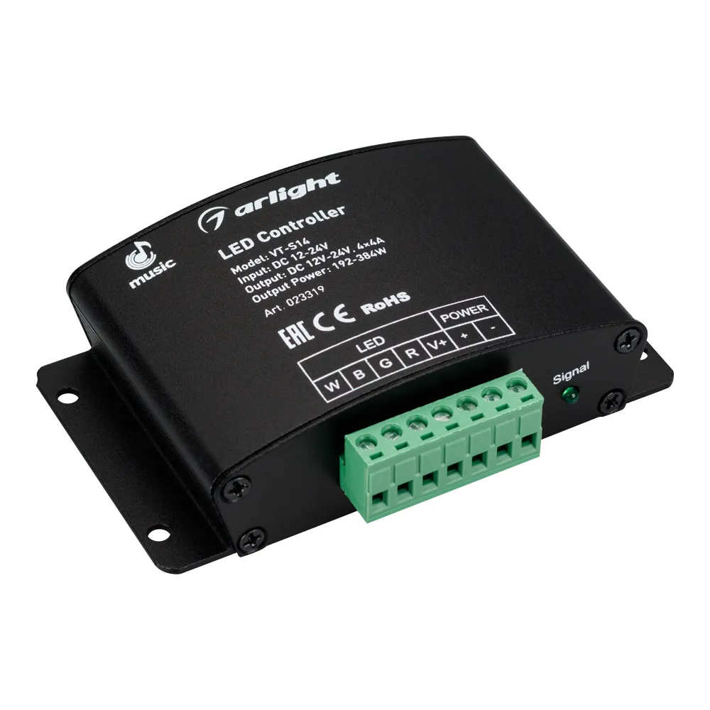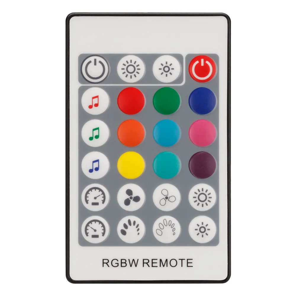 RGBW-АУДИО-контроллер с RF ДУ (24 кнопки), рег-ка яркости, цветности, скорости, 3 аудиорежима. Вход аудио из внешнего микрофона, регулировка усиления. Выход 12-24V 192-384W, 4х4A. Габариты 108х63х28 мм. Вместо 019938.