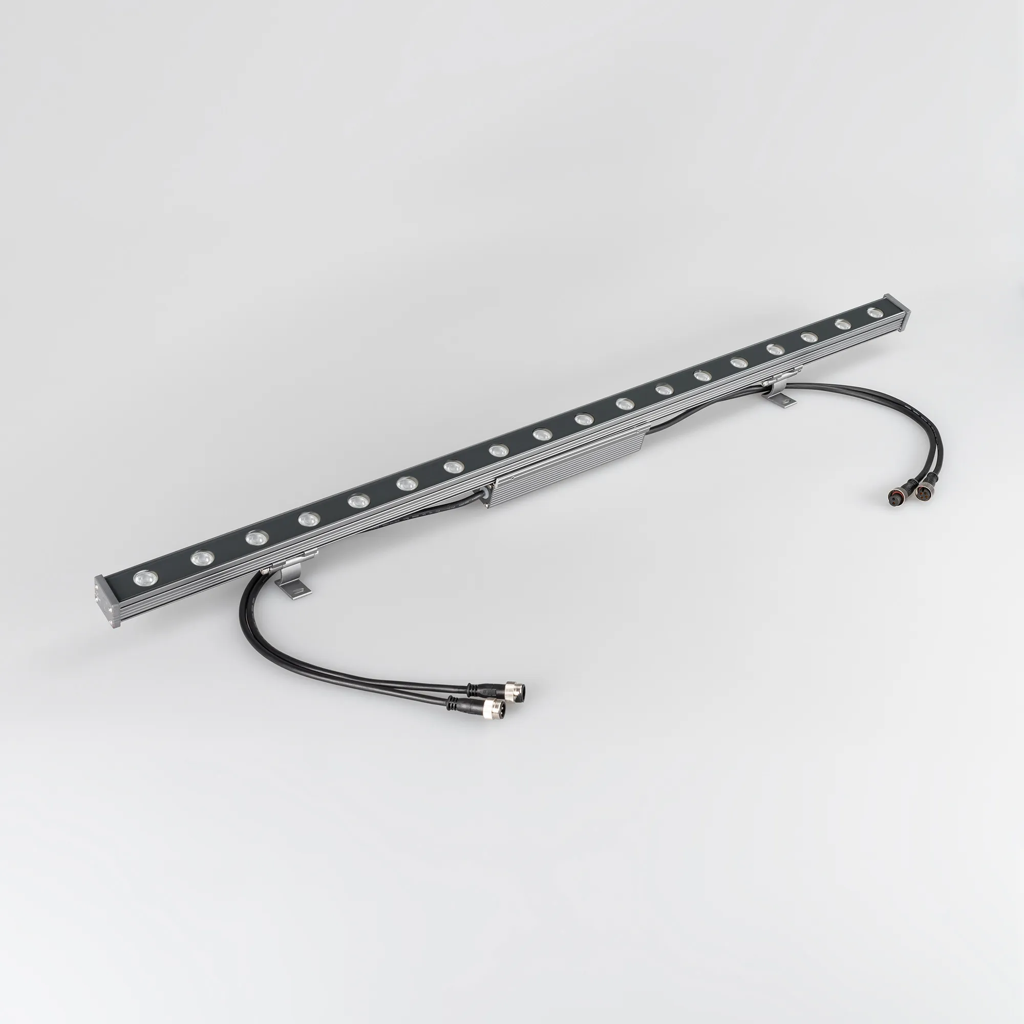 Ультратонкий линейный светодиодный прожектор. Мощность 18W, напряжение питания DC 24V. Светодиоды EPILED 18 штук. Цвет светодиодов RGB, управление по протоколу DMX512, угол рассеивания 30°. Корпус: алюминиевый сплав и армированное стекло. Цвет корпуса серый, степень влагозащиты IP65. Габариты 1000x40x30мм.