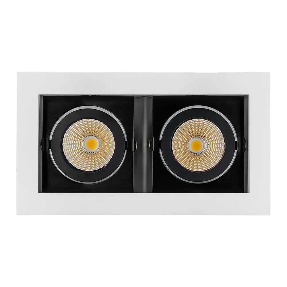 Встраиваемый карданный светильник. Угол 38° / 2x9Вт / ТЕПЛЫЙ БЕЛЫЙ 3000K / 1440лм, CRI>80. Корпус из белого алюминия с черными вставками. Питание AC180-240V, 18Вт, в комплекте 2 драйвера 200mA 30-45V. Размеры LxWxH: 180х102x85мм, отверстие для установки 160x85мм.
