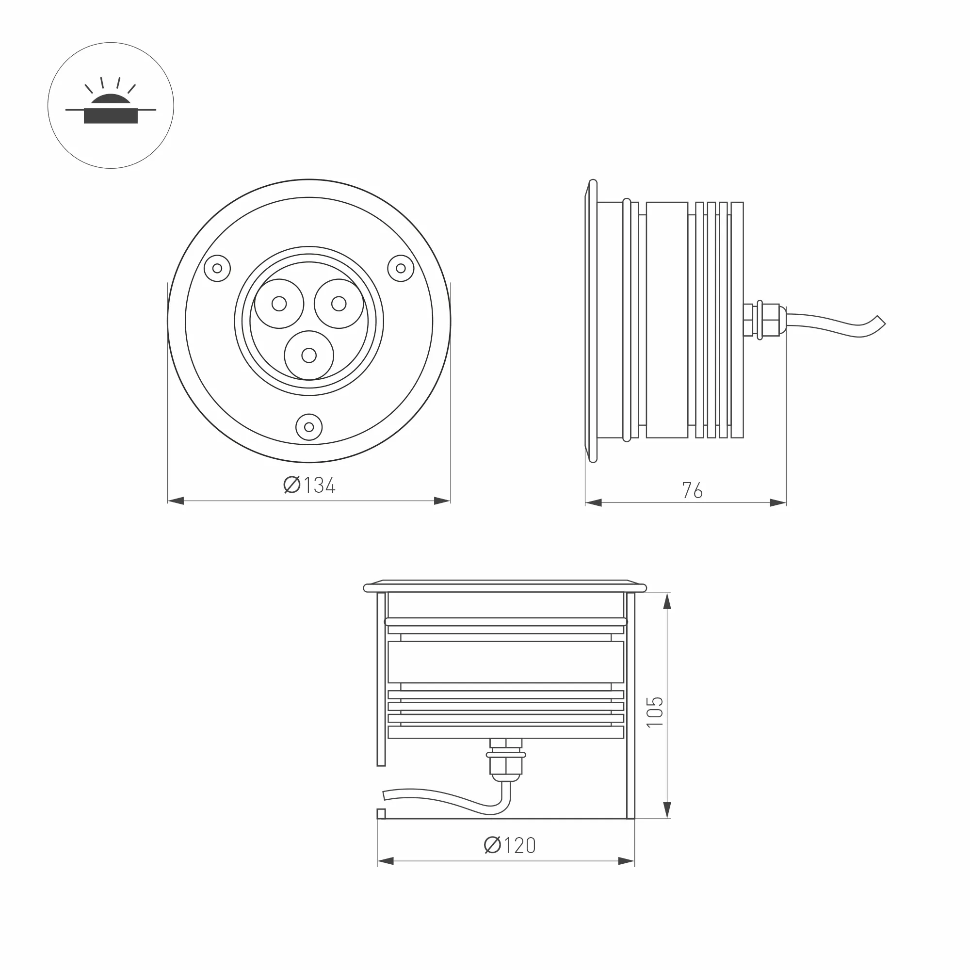 Встраиваемый светодиодный светильник для грунта и пола с возможностью регулировки направления луча вручную. Мощность 9Вт, цвет RGB. Световой поток 310лм, угол 23°, наклон луча изменяемый 20°. Круглый влагозащищенный корпус IP67, нержавеющая сталь. Экран закалённое стекло. Питание DC24V, 9Вт. Размер DxH Ø134x76мм. Установка в отверстие DxH Ø120x105мм.