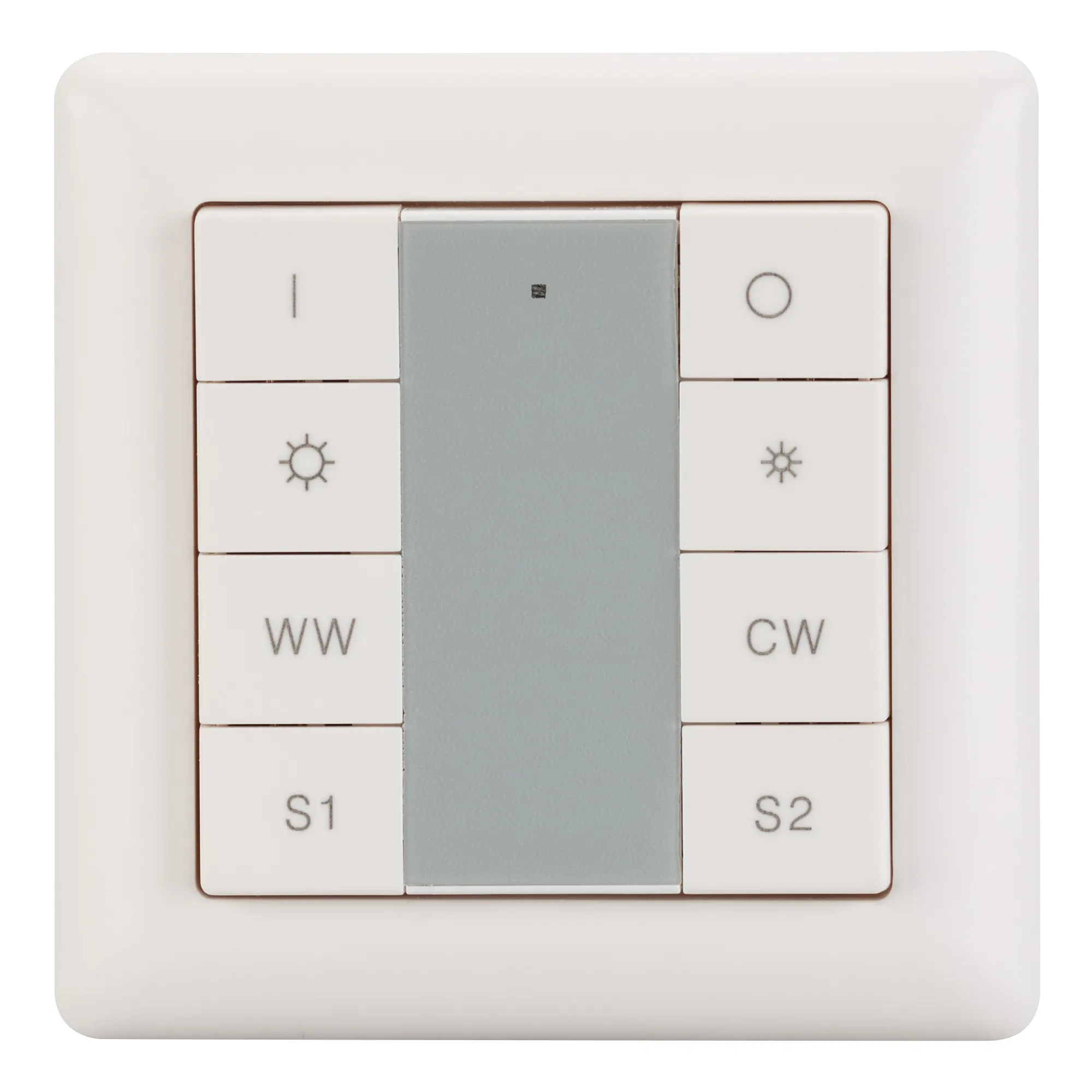 Встраиваемая кнопочная белая пластиковая панель для работы по протоколу DALI. Включение/выключение, диммирование и управления цветом свечения (MIX, CCT, HCL) 1 группы. Вызов и сохранение 2-х сцен. Поддержка команд DT8, при адресации 2 каналов (CW+WW) на 1 адрес. Возможно широковещательное управление. Установка номера группы и номера первой сцены выполняется переключателями на корпусе. Питание от шины DALI (4 мА). Стандартная рамка входит в комплект поставки.
