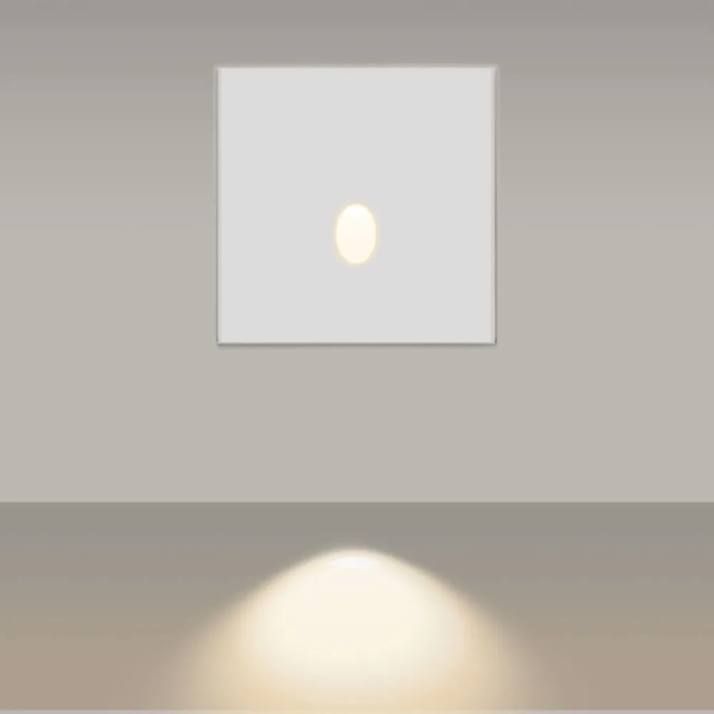 Светодиодный встраиваемый квадратный светильник для стен, лестниц, 3Вт. Цвет ТЕПЛЫЙ 3000К, световой поток 120лм, угол 30°, CRI>80. Влагозащищенный корпус IP65, белый алюминий. Питание AC230V, мощность 3Вт. Размеры LxWxH 70x70x97мм (закладная часть Ø62x95мм).