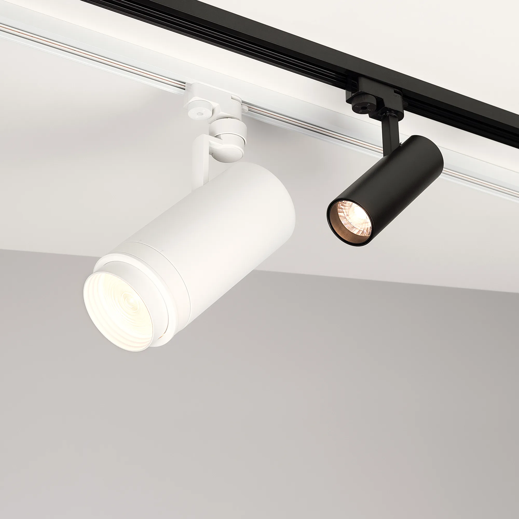 Светильник подвесной для треков/шин 2 провода. Мощность 20 Вт, св. поток 1800-2200 лм, 90 лм/Вт, теплый 3000 K, CRI>90, угол 24°, напряжение питания 230 В. Черный круглый корпус из алюминия, материал линзы PMMA , степень защиты IP20. Размер: диаметр 74 мм, высота 160 мм. Монтаж на трек 1-фазный. Драйвер встроенный 30-42 В, 500 мА., пульсация <1%.