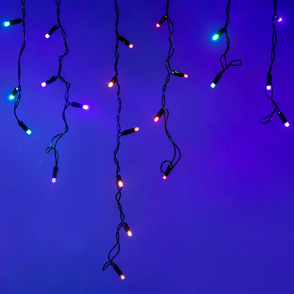 Светодиодная бахрома Classic. Размер 2400 мм (длина 2400 мм, по длине 24 нити высотой 200 / 600 мм). Цвет свечения RGB (цвет светодиодов чередуется), динамические и статические эффекты свечения свечения с резким световым рисунком (прозрачная вогнутая линза). Провод черный, ПВХ. Питание 230 В, Мощность 6 Вт, защита IP65, применение на улице под навесом. Аксессуары для подключения приобретаются отдельно.