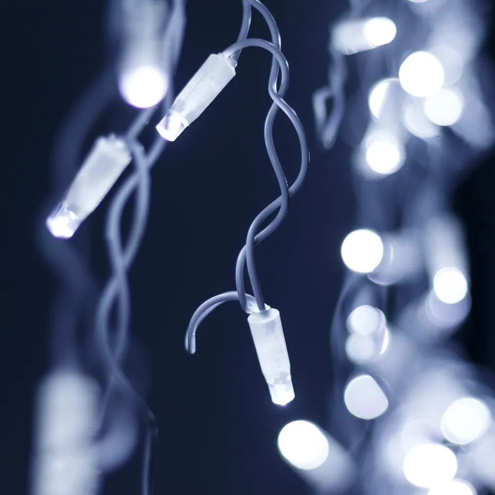 Светодиодная бахрома Pro. Размер 4000x600 мм (длина 4000 мм, по длине 32 нити высотой 200/600 мм). Количество светодиодов 128 шт размером 7 мм. Цвет свечения БЕЛЫЙ (6000 К), эффект постоянного свечения с резким световым рисунком (прозрачная вогнутая линза). Провод белый, резиновый. Питание 230 В, Мощность 8 Вт, защита IP65, применение на улице под навесом. Аксессуары для подключения приобретаются отдельно.