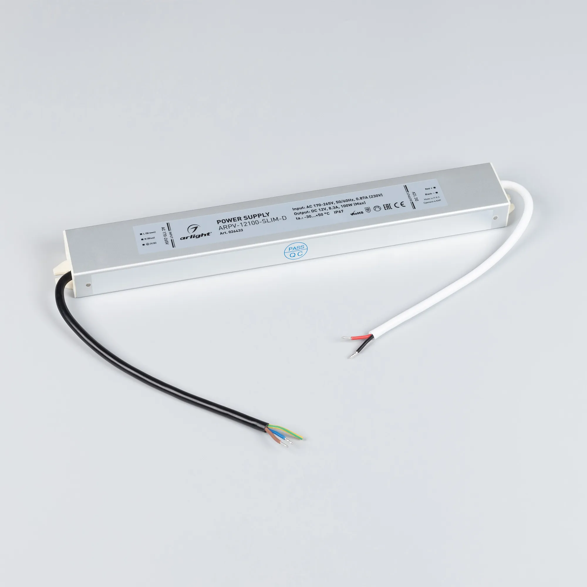 Источник напряжения с гальванической развязкой для светодиодных изделий. Входное напряжение 170-265 VAC. Выходные параметры: 12 В, 8,3 А, 100 Вт. Герметичный алюминиевый корпус IP 67. Рабочая температура -30…+50C⁰. Габаритные размеры длина 303 мм, ширина 40 мм, высота 22 мм. Гарантийный срок 3 года.