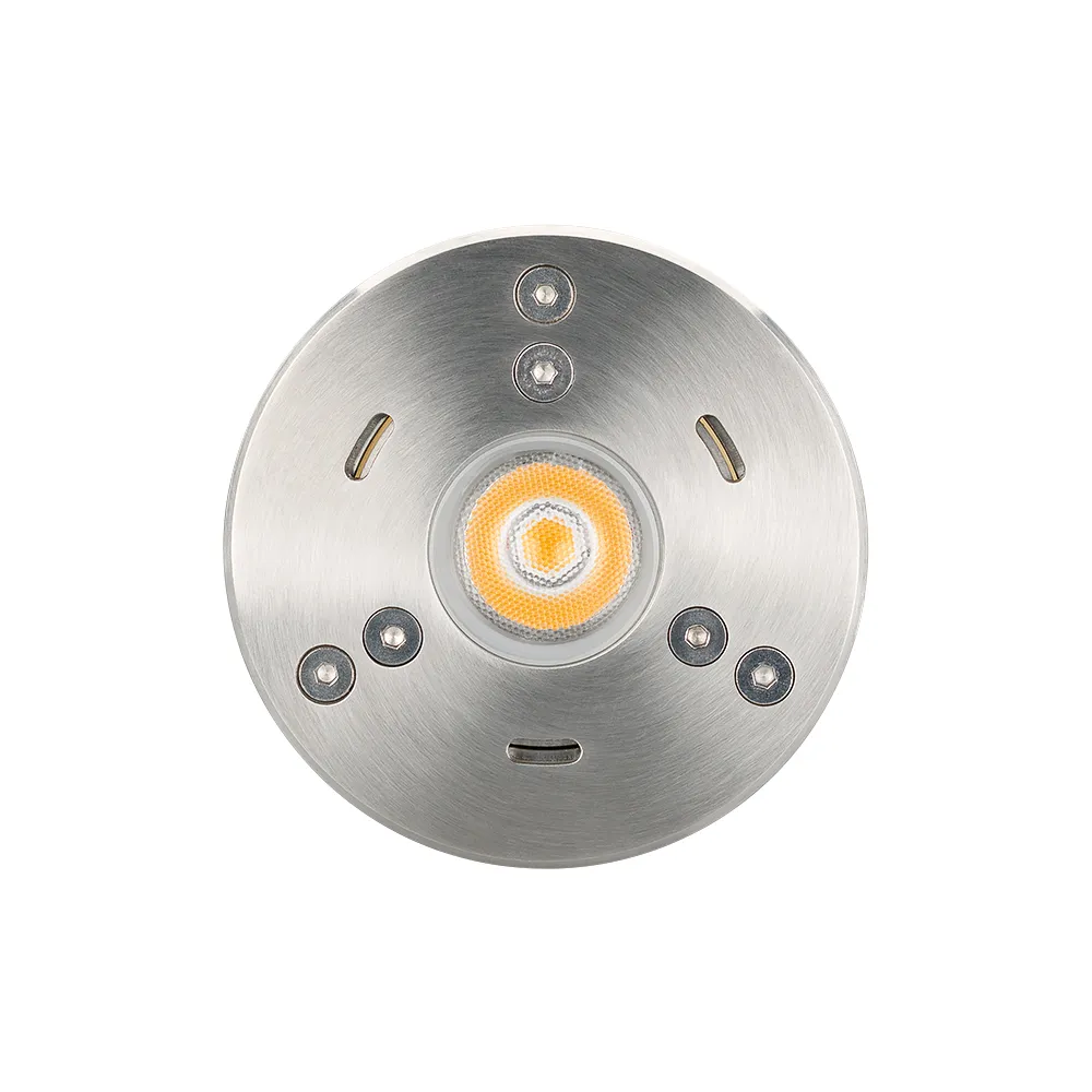Подводный светодиодный светильник, мощность 7Вт, угол освещения 25°. Цвет БЕЛЫЙ 6000К, световой поток 564лм, CRI>80. Влагозащищенный корпус IP68 - серебристая нержавеющая сталь 316, экран из закаленного стекла. Питание DC12В, мощность 7Вт. Размеры DxH Ø84х48мм. Установка в отверстие DxH Ø74х106мм В комплекте 5м провод. Максимальная глубина установки под водой 2м. ВНИМАНИЕ! Светильник не поддерживает регулирование светового потока ШИМ.