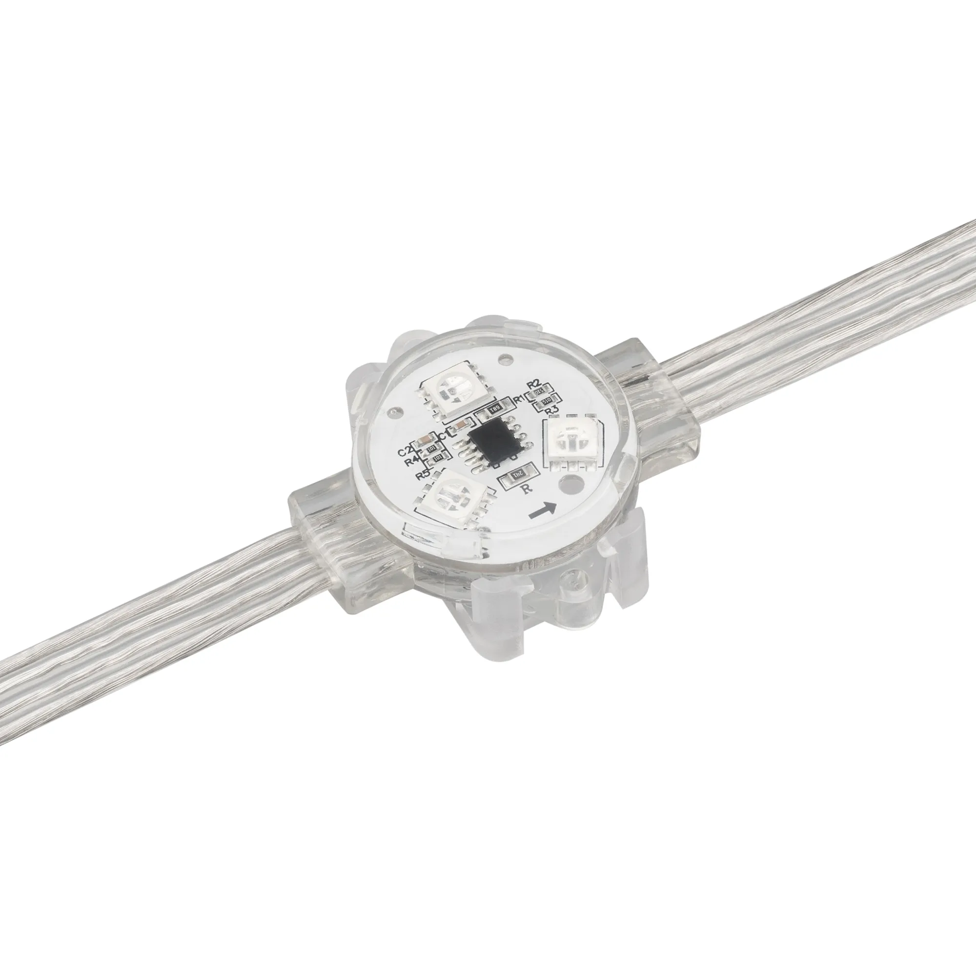 Управляемый светодиодный модуль SPI с держателем, RGB, микросхема SM16703, напряжение 12 В, мощность 0.75 Вт, 3 светодиода SMD 5060, угол 120°. Создание медиафасадов. Функция обхода битого пикселя. 20 шт на проводе, расстояние между центрами модулей 150 мм, длина провода между модулями 120 мм. IP 68. Размер Ø30×11.2 мм. Гарантия 3 года. В комплекте инжектор питания.