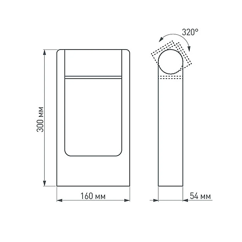 300мм уличный светодиодный светильник для дорожек, изменяемый угол освещения (111 градусов), на 2 стороны. Цвет ТЕПЛЫЙ БЕЛЫЙ 3000К, светодиоды 6Вт SMD (276 лм). Влагозащищенный корпус IP65 - черный алюминий, экран ударопрочный PC. Питание 230В, мощность 6 Вт. Размеры ВхШхГ 300х160х54 мм.