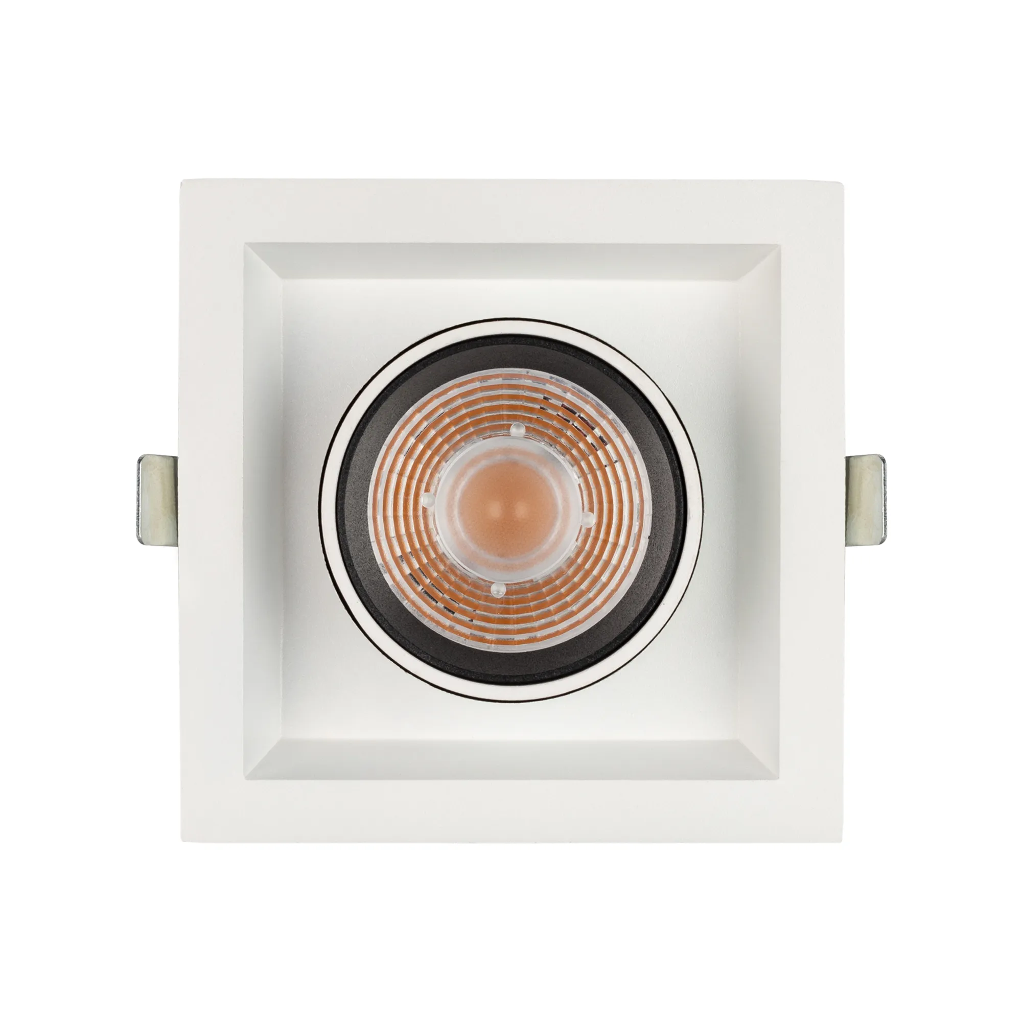 Встраиваемый поворотный выдвигающийся светильник для потолка. Мощность 10 Вт, св. поток 900 лм, 90 лм/Вт, дневной 4000 K, CRI>90, угол 24°, напряжение питания 230 В. Белый квадратный корпус из алюминия, экран PC, степень защиты IP20. Размер (Д×Ш×В) 112×112×127 мм. Монтаж встраиваемый, установочное отверстие Ø 100 мм. Драйвер 30-48 В, 250 мА, пульсация <1%.
