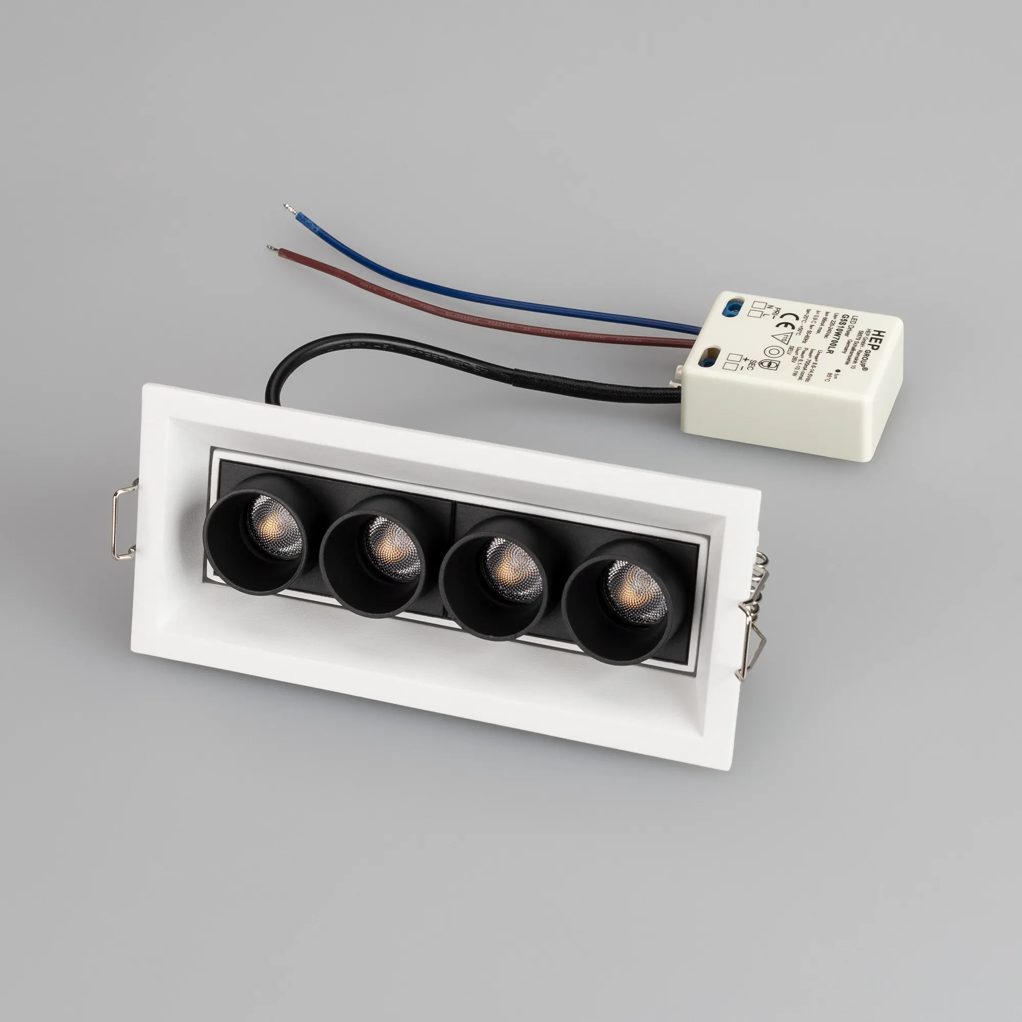 Встраиваемый поворотный светильник. Мощность 10 Вт, св. поток 750 лм, 75 лм/Вт, теплый 3000 K, CRI>98, угол 30°, напряжение питания 230 В. Белый прямоугольный корпус из алюминия, экран PMMA, степень защиты IP20. Размер: длина 150 мм, ширина 67 мм, высота 50 мм. Монтаж встраиваемый, установочное отверстие длина 145 мм, ширина 60 мм. Драйвер 9-14 В, 700 мА, пульсация <1%.
