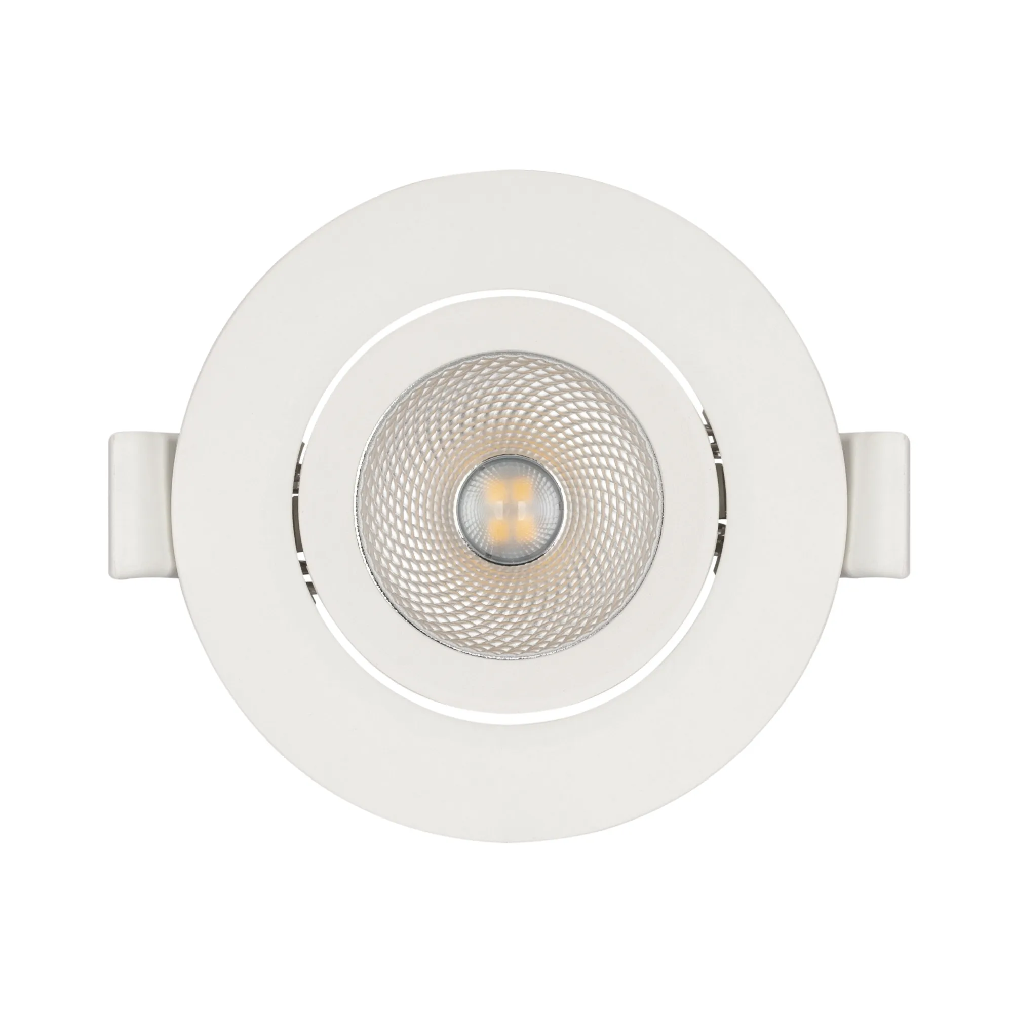Встраиваемый поворотный светильник "даунлайт". Мощность 4.5 Вт, св. поток 400 лм, 89 лм/Вт, теплый 3000 K, CRI>80, UGR<19, угол 36°, напряжение питания 230 В. Белый круглый корпус из теплопроводящего полиамида, экран пластик, степень защиты IP20, угол поворота оси 30°. Размер: диаметр 80 мм, высота 37.5 мм. Монтаж встраиваемый, установочное отверстие диаметр 60-70 мм. Пульсация <2%.