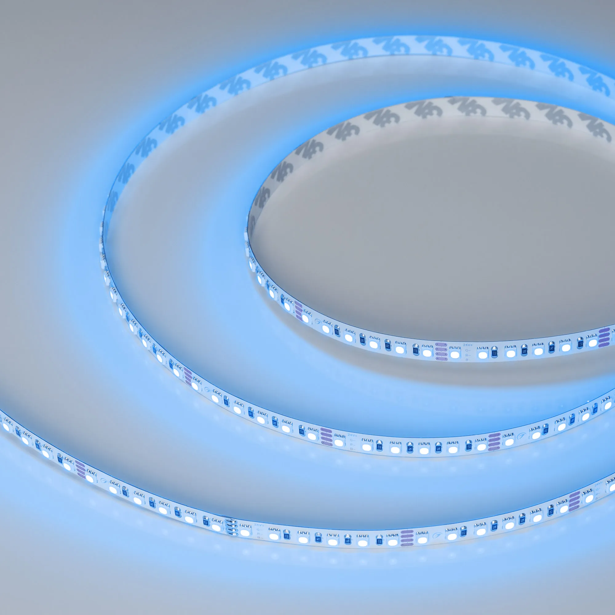 Мультицветная лента серии RT G120. Светодиоды SMD 3838, 120 шт/м, белая плата шириной 8 мм, скотч 3M. Цвет RGB. Питание 24 В, мощность 11 Вт/м (55 Вт на 5 м), угол 120°. Размеры 5000x8x1.9 мм. Мин. отрезок 50 мм, 6 светодиодов. Цена за 1 м.