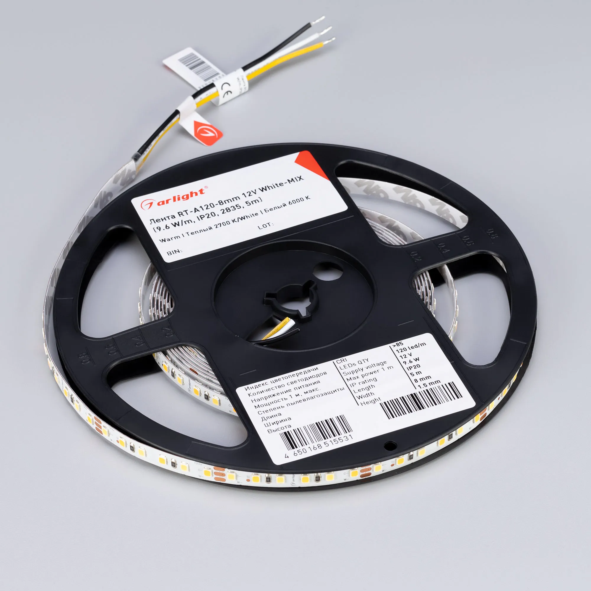 Лента светодиодная RT-A120-8mm 12V White-MIX (9.6 W/m, IP20, 2835, 5m) (Arlight, Изменяемая ЦТ)