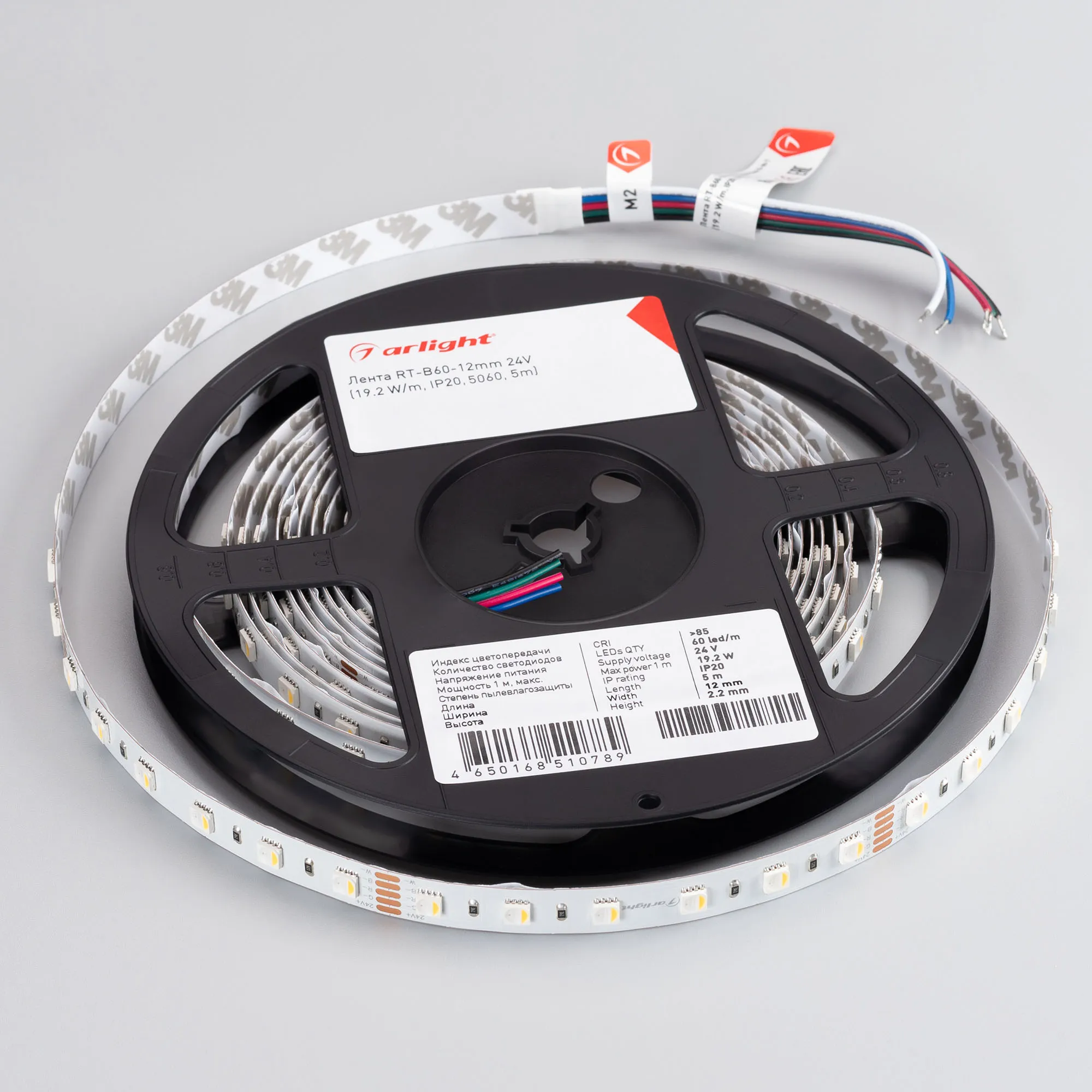 Светодиодная лента RT серии B60. Светодиоды 5060 4-in-1, 60 шт/м, белая плата шириной 12 мм, скотч 3M. Цвет RGB + БЕЛЫЙ 6000K, индекс цветопередачи CRI>85, угол 120°. Питание 24 В, мощность 19.2 Вт/м (96 Вт на 5 м). Размеры 5000x12x2.2 мм. Мин. отрезок 100 мм, 6 светодиодов. Цена за 1 м.