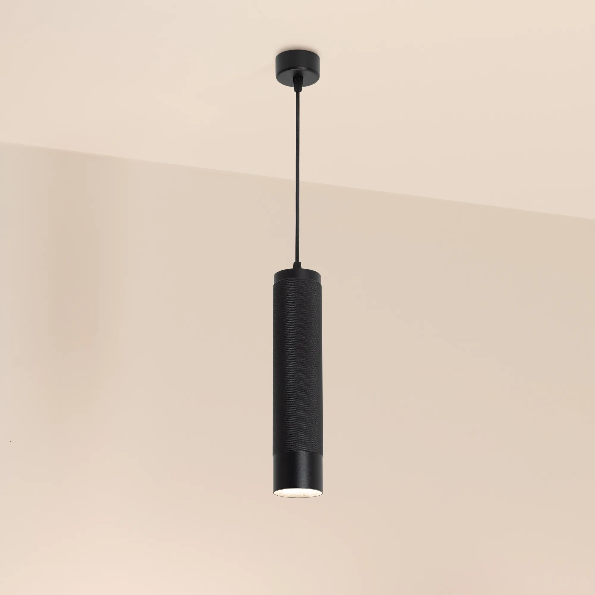 Подвесной светильник. Мощность 13 Вт, св. поток 732 лм, 57 лм/Вт, теплый 3000 K, CRI>90, угол 50°, напряжение питания 230 В. Черный круглый корпус из алюминия, рефлектор PC, степень защиты IP20. Размер: диаметр 70 мм, высота 300 мм, длина подвеса 1500 мм, размер чаши: диаметр 65 мм, высота 30 мм. Монтаж подвесной. Драйвер 24-42 В, 300 мА, пульсация <1%.