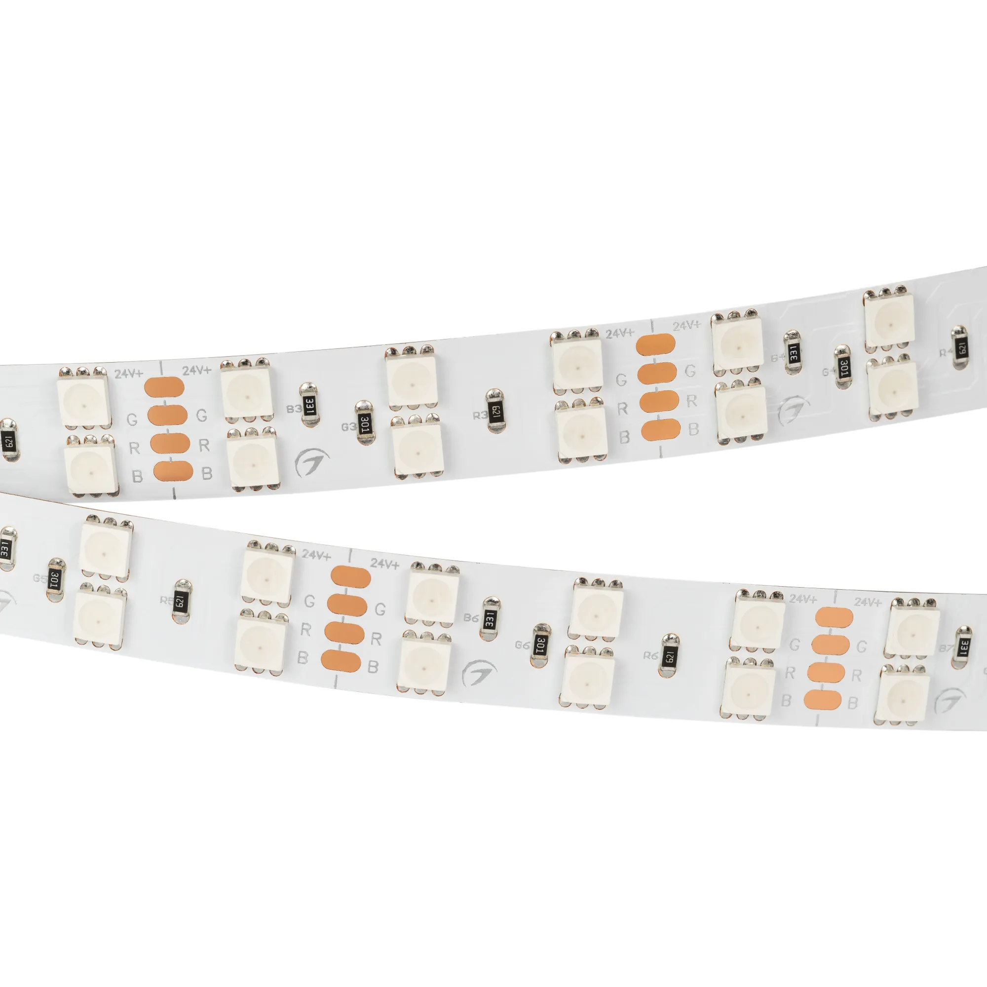Мультицветная широкая светодиодная лента RT серии B120. Светодиоды SMD 5060, 120 шт/м, белая плата шириной 15 мм, скотч 3M. Цвет RGB, угол 120°. Питание 24 В, мощность 28.8 Вт/м (144 Вт на 5 м). Размеры 5000x15x2.2 мм. Мин. отрезок 50 мм, 6 светодиодов. Цена за 1 м. Обязательна установка на профиль.