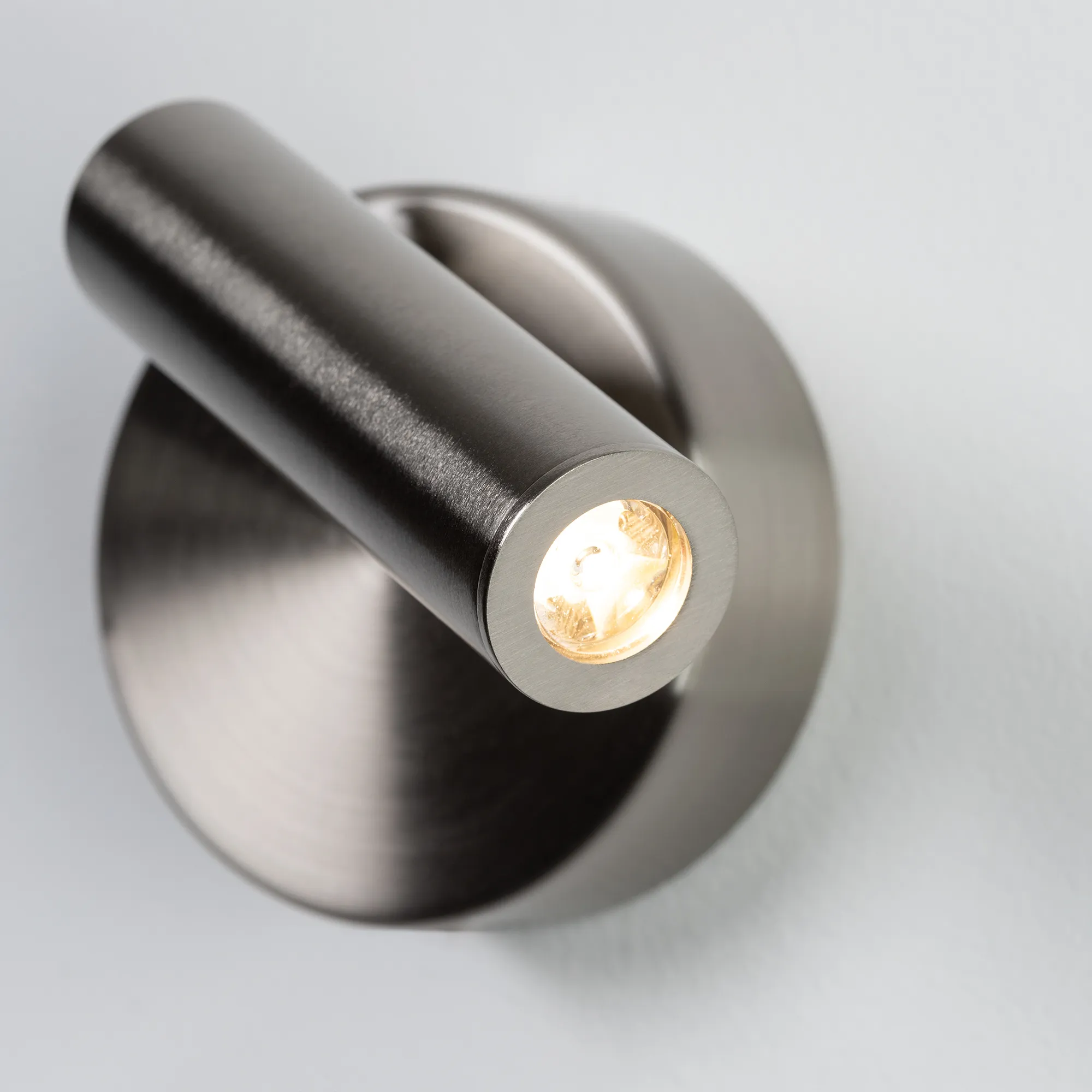 Накладной настенный светильник 3Вт,серебристый алюминиевый корпус. Цвет ТЕПЛЫЙ БЕЛЫЙ 3000K, св.поток 200лм, CRI(Ra)>80, угол 20°. Размер Основание Ф90x31мм, Светоизлучатель Ø30×110 мм. IP20. Питание AC220-240V, 3Вт, встроенный драйвер 2,5-4,5В, 700 мА.