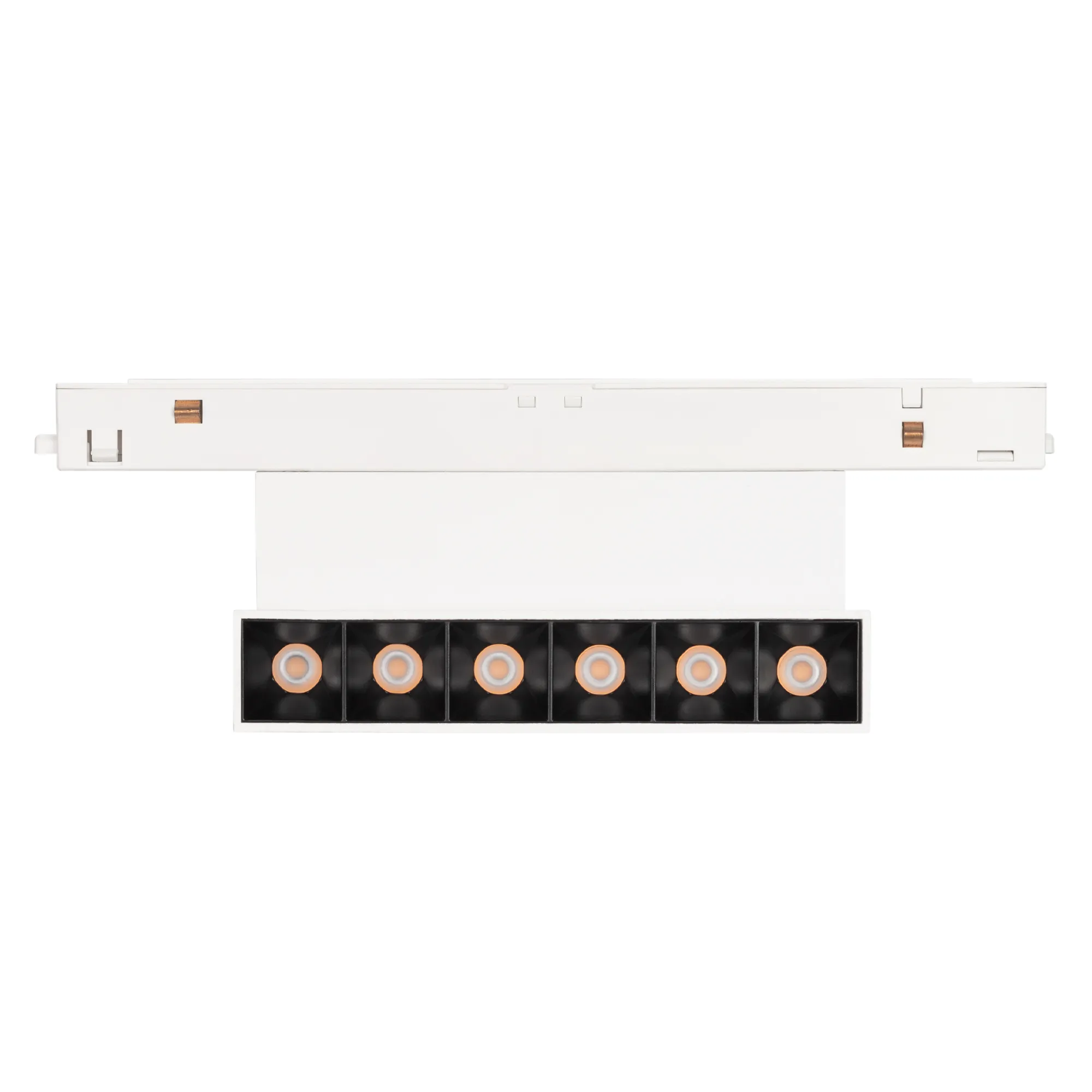 Светильник для магнитных треков MAG-ORIENT шириной 26 мм с управлением DALI. Мощность 6 Вт, св. поток 250 лм, 42 лм/Вт, дневной 4000 K, CRI>90, угол 30°, напряжение питания 48 В. Белый прямоугольный корпус из металл, экран поликарбонат, степень защиты IP20. Размер: длина 204 мм, ширина 23 мм, высота 104 мм. Монтаж на трек MAG-ORIENT. Пульсация <1%.