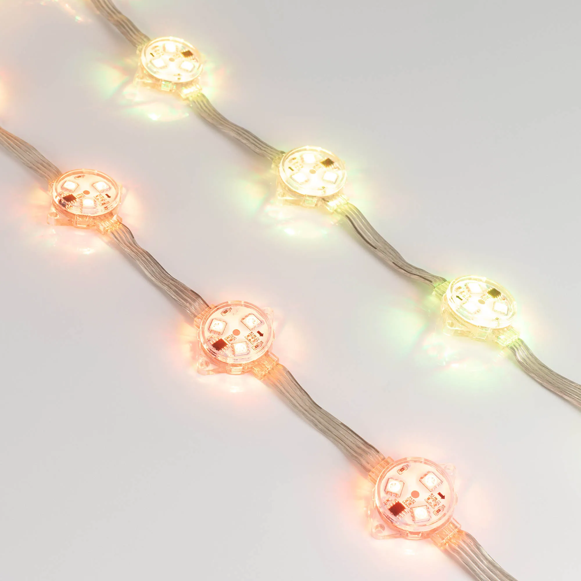 Управляемый светодиодный модуль DMX, RGB, микросхема DMX512 (UCS512), напряжение 12 В, мощность 0.72 Вт, 3 светодиода SMD 5060, угол 140°. Создание медиафасадов, 20 шт на проводе, расстояние между центрами модулей 100 мм, длина провода между модулями 60 мм. Степень пылевлагозащиты IP68. Размер Ø30×11 мм. Гарантия 3 года.