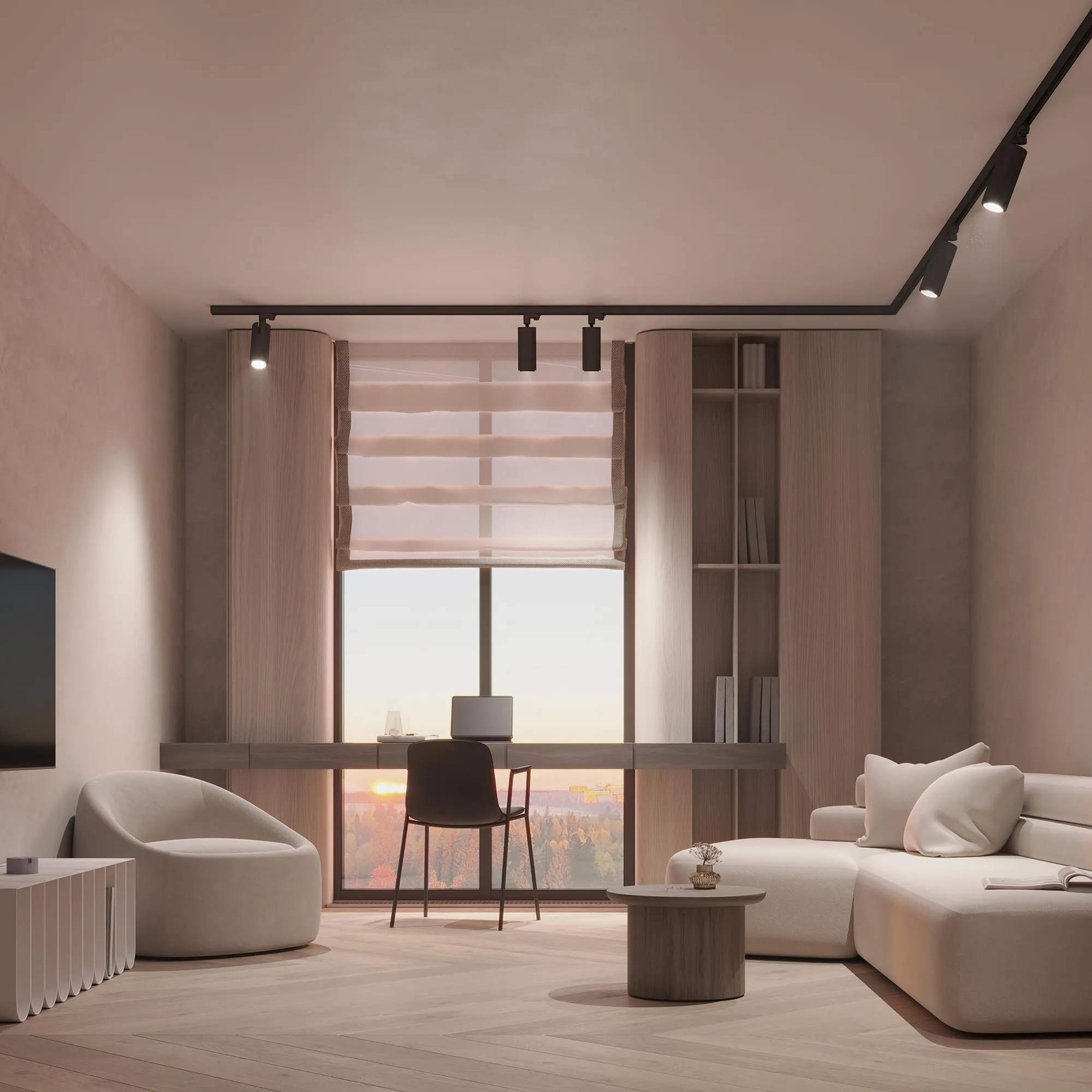 Светильник для треков/шин 4 провода, 20Вт. Цвет свечения меняется в диапазоне 3000К-6000К (возможность изменения цветовой температуры при помощи диммера DALI), световой поток 1500 лм, 74 лм/Вт, регулируемый угол 20-60°, CRI>90. Корпус круглый, металл, цвет черный, IP20. Размеры DxL Ø80x1816мм.. Входное напряжение AC220-240V, мощность 20Вт. Драйвер встроенный 12-54 В, 500 мА. Совместим только с шинопроводом серии С.