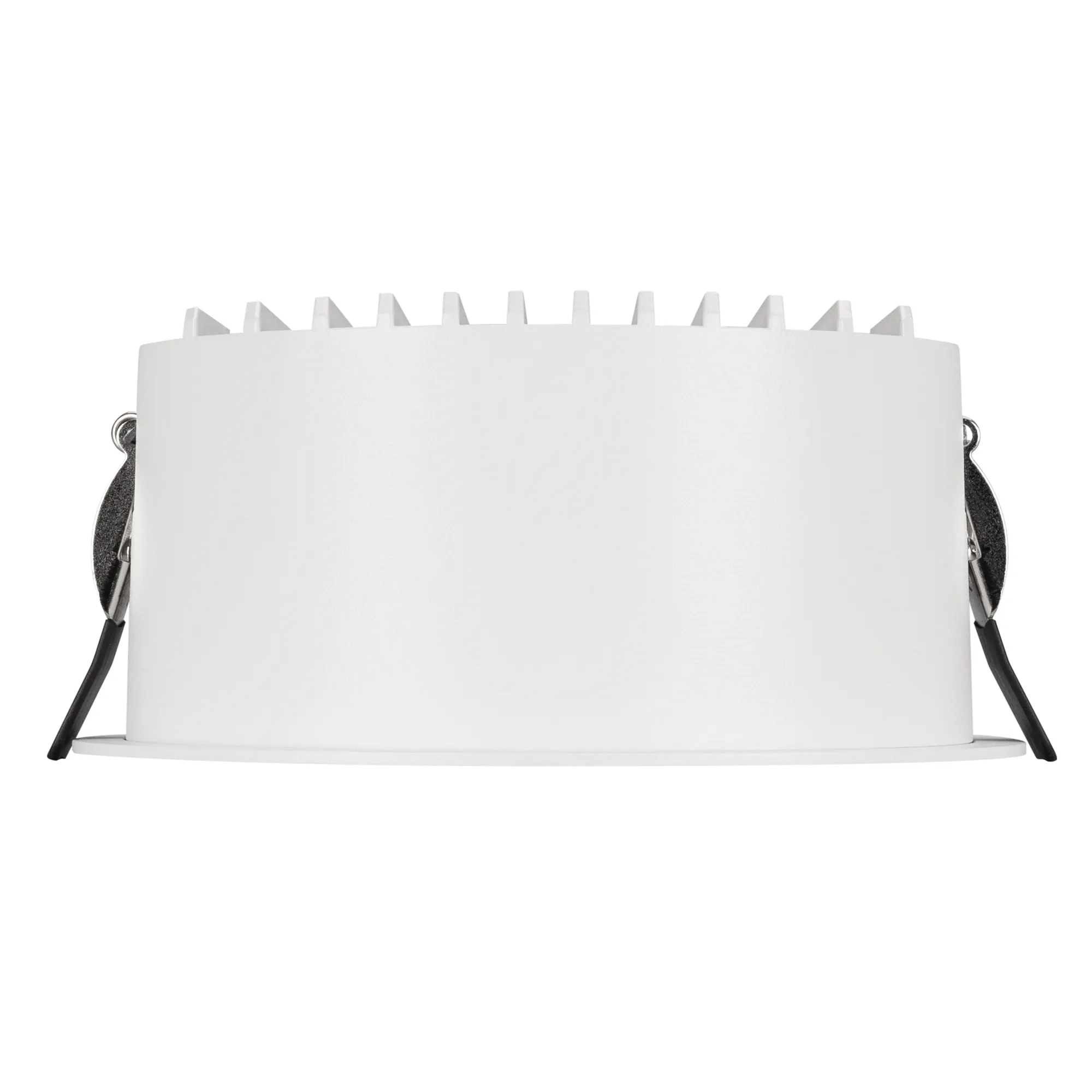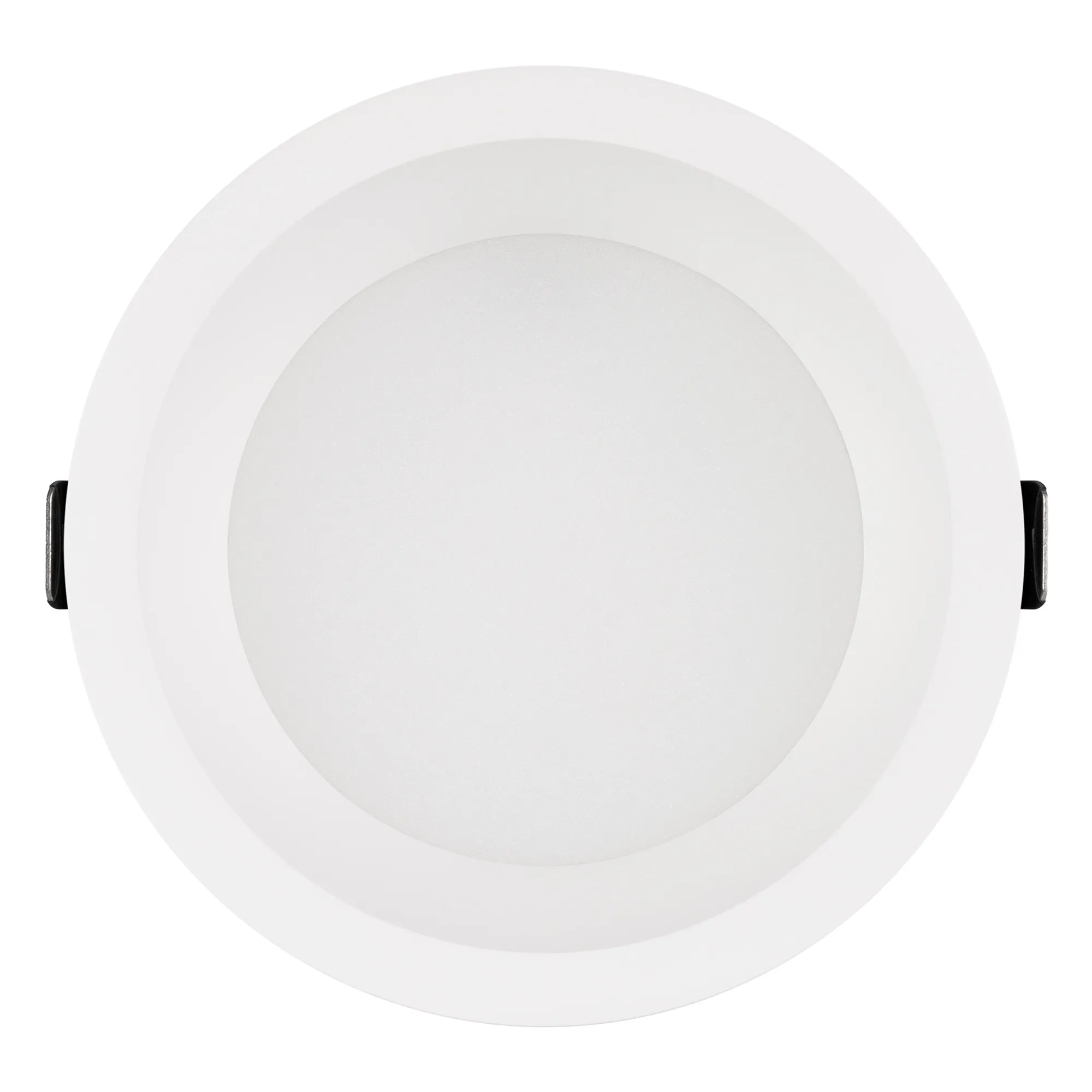 Встраиваемый светильник даунлайт. Мощность 30 Вт, св. поток 2950 лм, 98 лм/Вт, дневной 4000 K, CRI>90, угол 90°, напряжение питания 230 В. Белый круглый корпус из алюминия, степень защиты IP54. Размер: диаметр 158 мм, высота 72 мм. Монтаж встраиваемый, установочное отверстие: диаметр 145 мм. Драйвер IP54, 27-43 В, 800 мА, пульсация <2%.