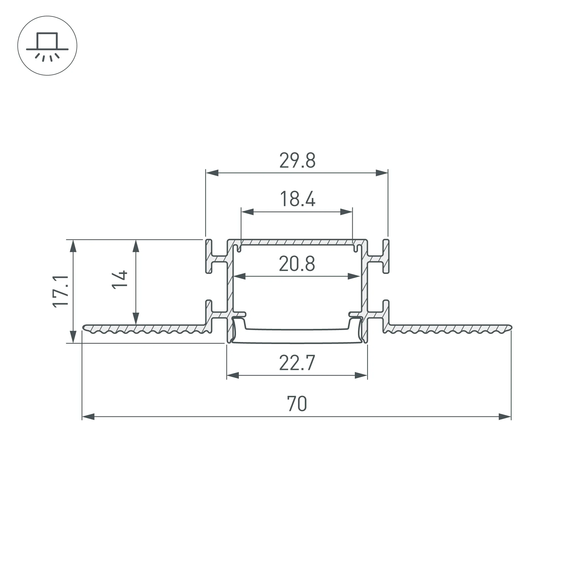 Алюминиевый встраиваемый профиль для светодиодных лент и линеек. Габаритные размеры (L×W×H): 2000х70х17.1 мм. Ширина площадки для ленты 17 мм. Экраны, заглушки и другие аксессуары приобретаются отдельно. Цена за 1 метр.