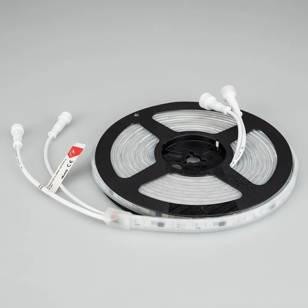 Герметичная лента «Бегущие огни» с драйвером 16703, в прозрачной силиконовой трубке (IP66), со СКОТЧЕМ 3M на обрат. стороне. Рекоменд-ся подводка пит-я с 2 сторон ленты. Длина 5м, 300шт LED RGB 5060, 20 pixel/m (1 pixel = 3 LED). Управление от внешнего контроллера SPI, без авторежима. Питание 12V, макс. мощн-ть 14,4 Вт/м (статический белый цвет). Ширина 12 мм. Герметичные круглые коннекторы.