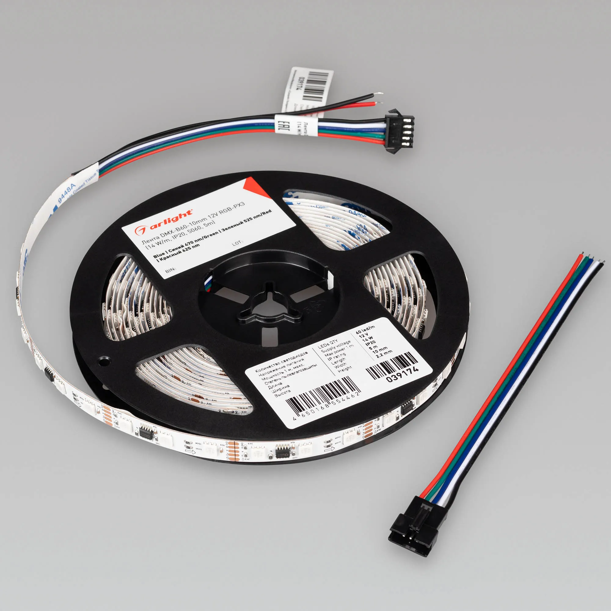 Светодиодная лента DMX серии B60 с микросхемой GS8526. Светодиоды SMD 5060, 60 шт/м, 20 pixels на 1 м (100 pixels на 5 м), 1 pixel = 3 светодиода, белая плата шириной 10 мм, скотч 3М. Цвет RGB, угол 120°. Питание 12 В, мощность 14 Вт/м (70 Вт на 5 м). Размеры 5000x10x2.2 мм. Мин. отрезок 50 мм, 3 светодиода. Цена за 1 м.