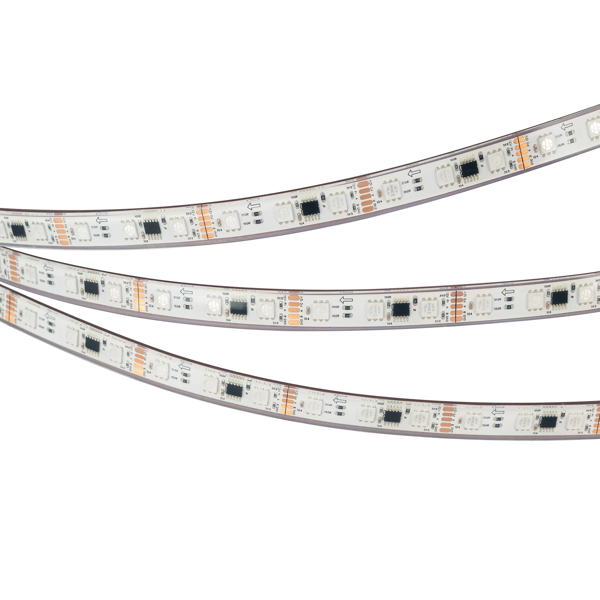 Светодиодная герметичная лента DMX серии B60 с микросхемой GS8516 (GS8526), IP68 (PFS - полная силиконовая экструзия). Светодиоды SMD 5060, 60 шт/м, 20 pixels на 1 м (100 pixels на 5 м), 1 pixel = 3 светодиода, белая плата шириной 10 мм, скотч 3М. Цвет RGB, угол 120°. Питание 12 В, мощность 14 Вт/м (70 Вт на 5 м). Размеры 5000x12x5 мм. Мин. отрезок 50 мм, 3 светодиода. Цена за 1 м.