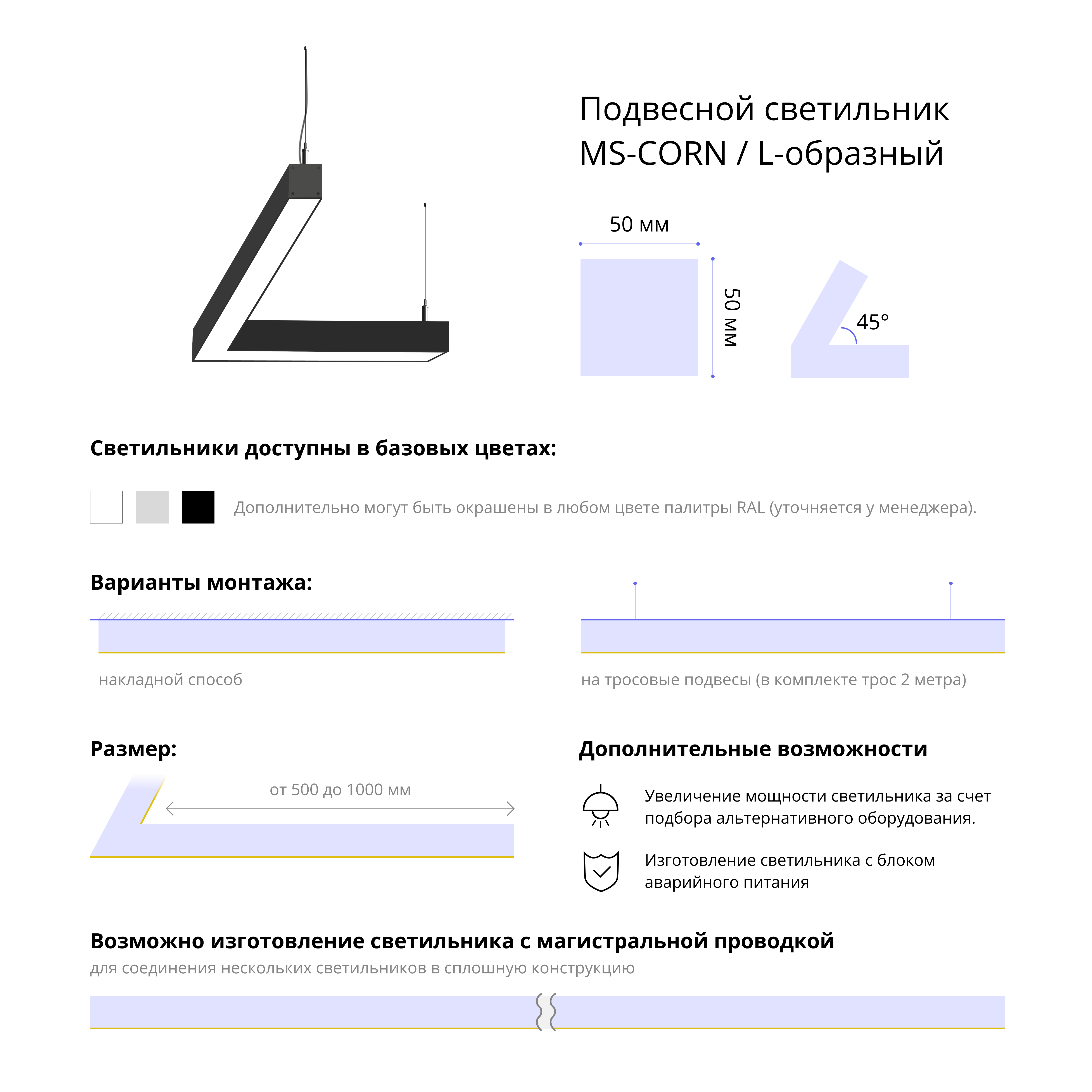 - Варианты монтажа: на тросовые подвесы (в комплекте трос 2 метра) и накладным способом.