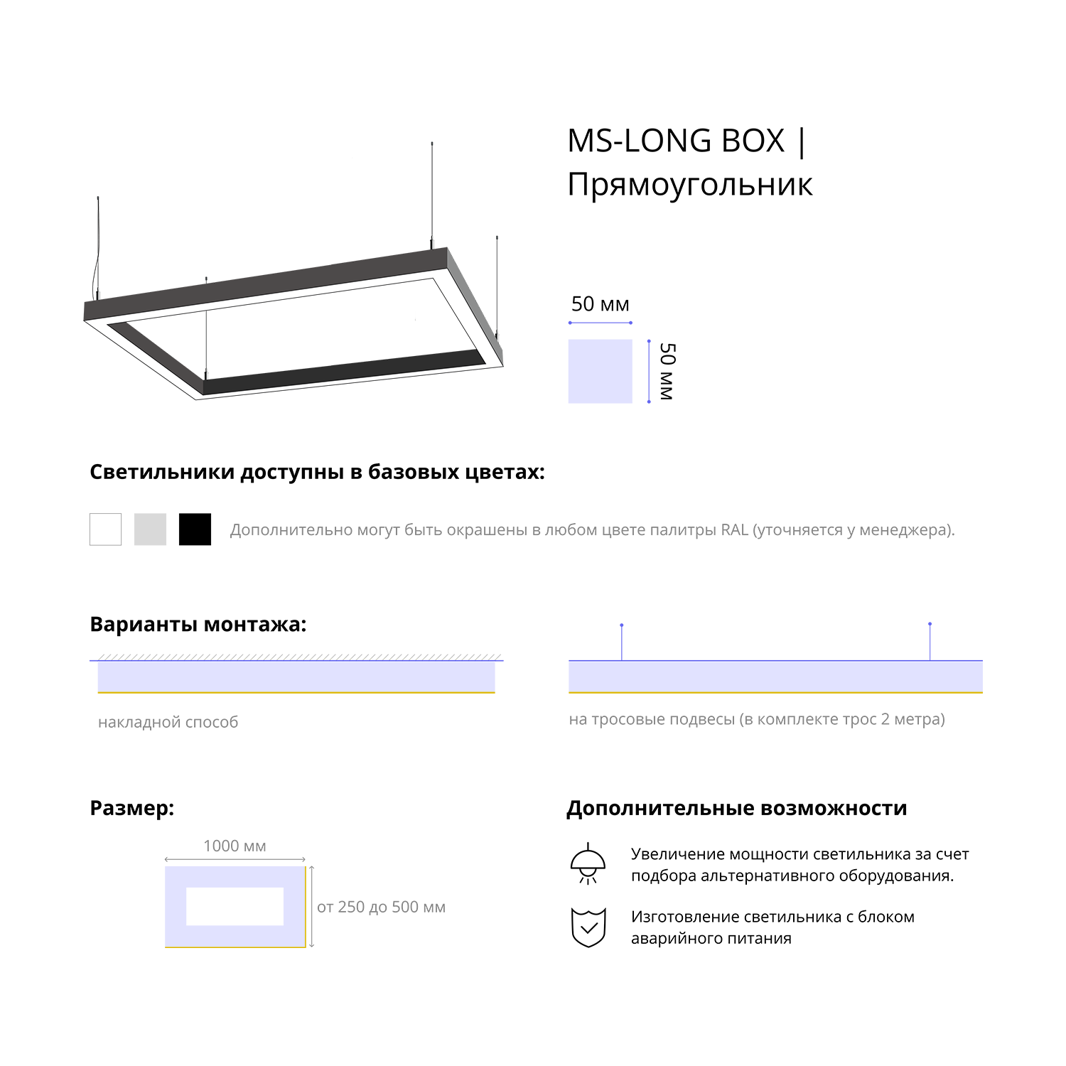 Cветодиодный фигурный светильник MS-LONG BOX Прямоугольник размер профиля 50x50мм длиной 1000х250мм мощностью 90W. Светильник собирается из алюминиевого основния с матовым рассеивателем, который дает равномерную засветку по всей площади.