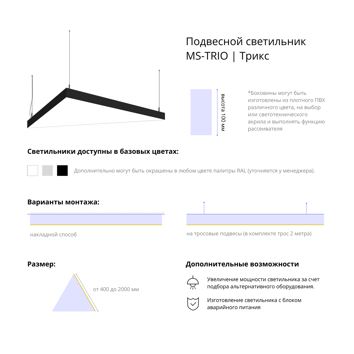 - Варианты монтажа: на тросовые подвесы (в комплекте трос 2 метра) и накладным способом.