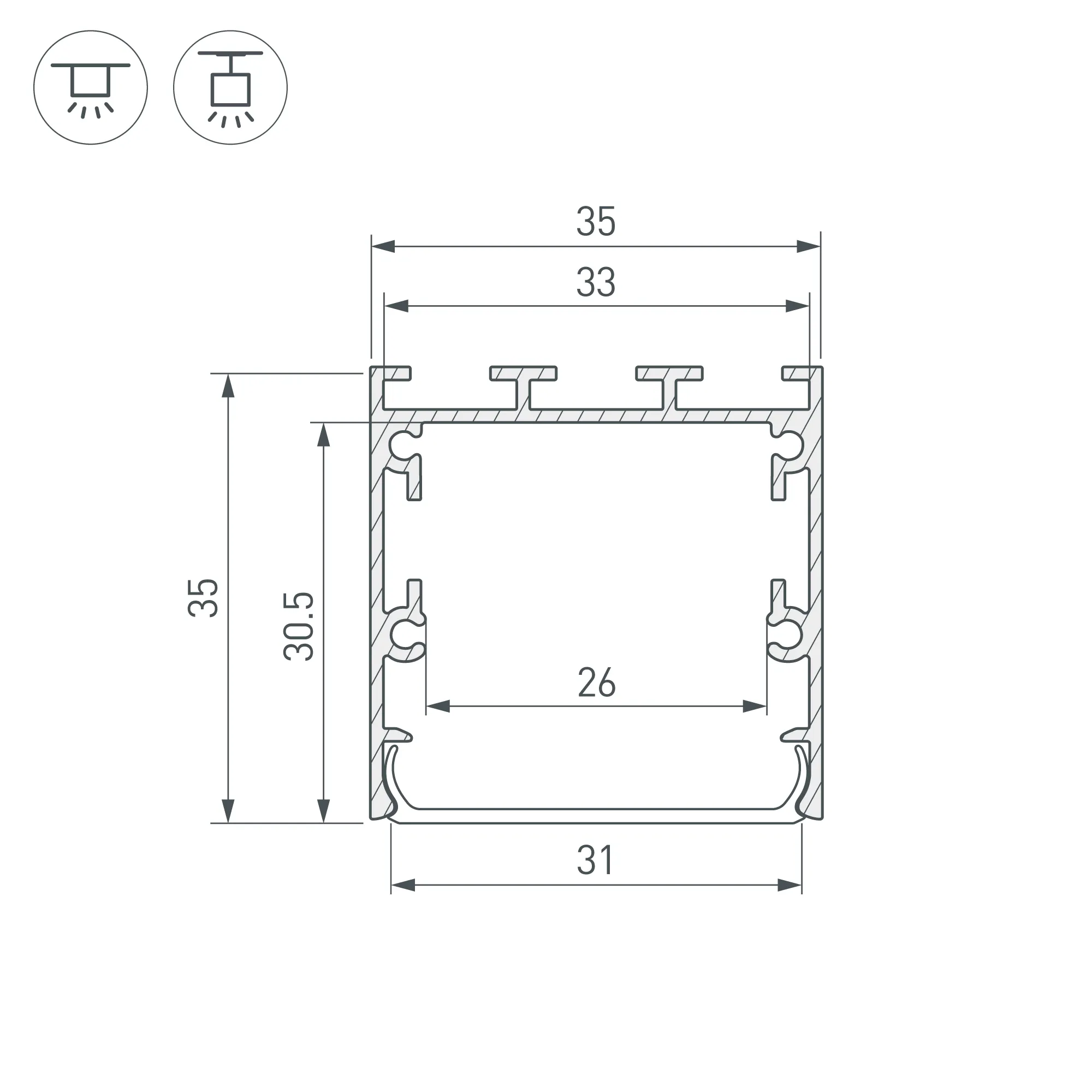 Алюминиевый анодированный профиль для светодиодных лент и линеек. Габаритные размеры (L×W×H): 2500x35x35,5 мм. Ширина площадки для ленты 26 мм. Экраны, заглушки и другие аксессуары приобретаются отдельно. Цена за 1 метр.