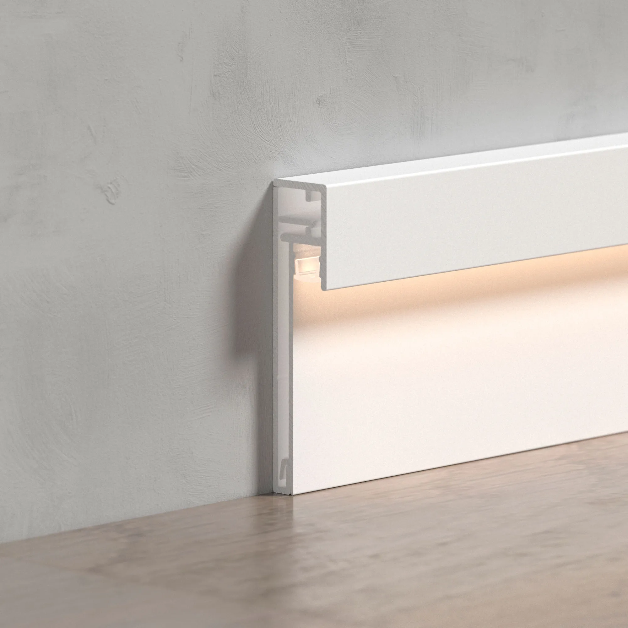 Алюминиевый накладной двухкомпонентный профиль-плинтус для светодиодных лент и линеек. Цвет - белый RAL9003 (порошковая окраска). Габаритные размеры (L×W×H): 2000x12,3x52,6мм. Ширина площадки для ленты 5 мм. Аксессуары приобретаются отдельно. Цена за метр.