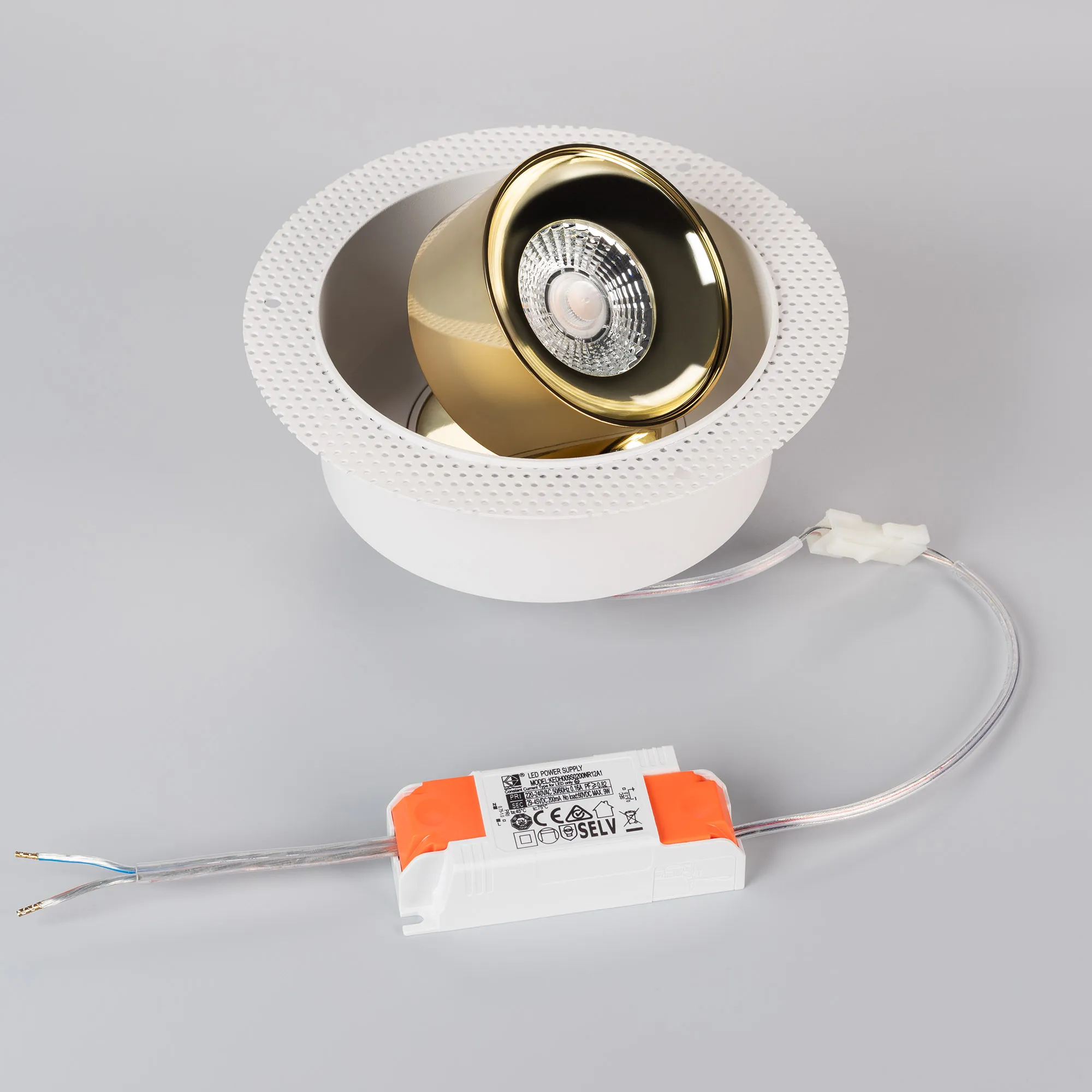 Светильник встраиваемый поворотный безрамочный. Мощность 9 Вт, св. поток 600 лм, 67 лм/Вт, дневной 4000 K, CRI>90, угол 36°, напряжение питания 230 В. Модуль Цвета Светлое Золото, Белый круглый корпус из алюминия, экран поликарбонат, степень защиты IP20. Размер: диаметр 160 мм, высота 80 мм. Монтаж встраиваемый, установочное отверстие: диаметр 125 мм. Драйвер 38 В, 200 мА, пульсация <1%.