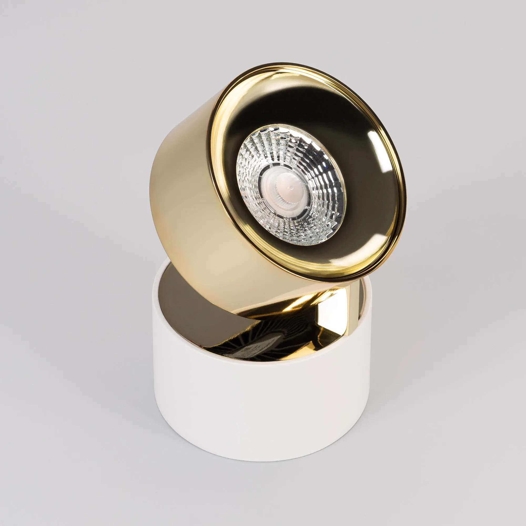 Светильник накладной поворотный. Мощность 9 Вт, св. поток 600 лм, 67 лм/Вт, дневной 4000 K, CRI>90, угол 36°, напряжение питания 230 В. Модуль Цвета Светлое Золото, Белый круглый корпус из алюминия, экран поликарбонат, степень защиты IP20. Размер: диаметр 77 мм, высота 92 мм. Монтаж накладной. Драйвер 38 В, 200 мА, пульсация <1%.