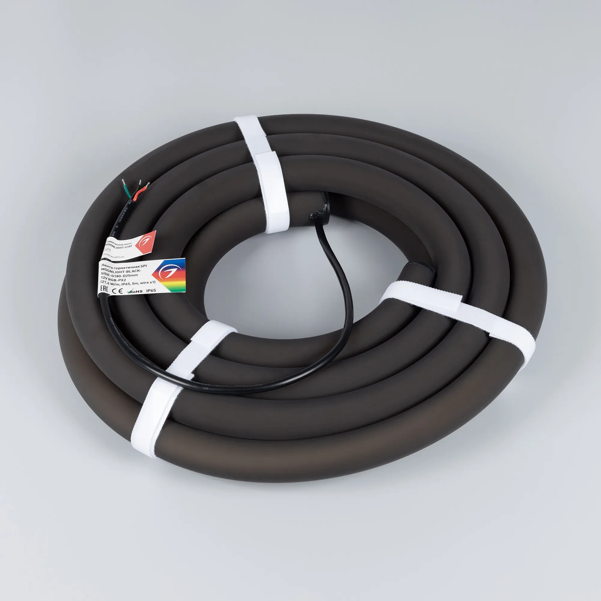 Лента светодиодная герметичная SPI MOONLIGHT-BLACK-SIDE-G180-D25mm 12V RGB-PX2 (21.6 W/m, IP65, 5m, wire x1) (Arlight, Вывод боковой, 3 года)