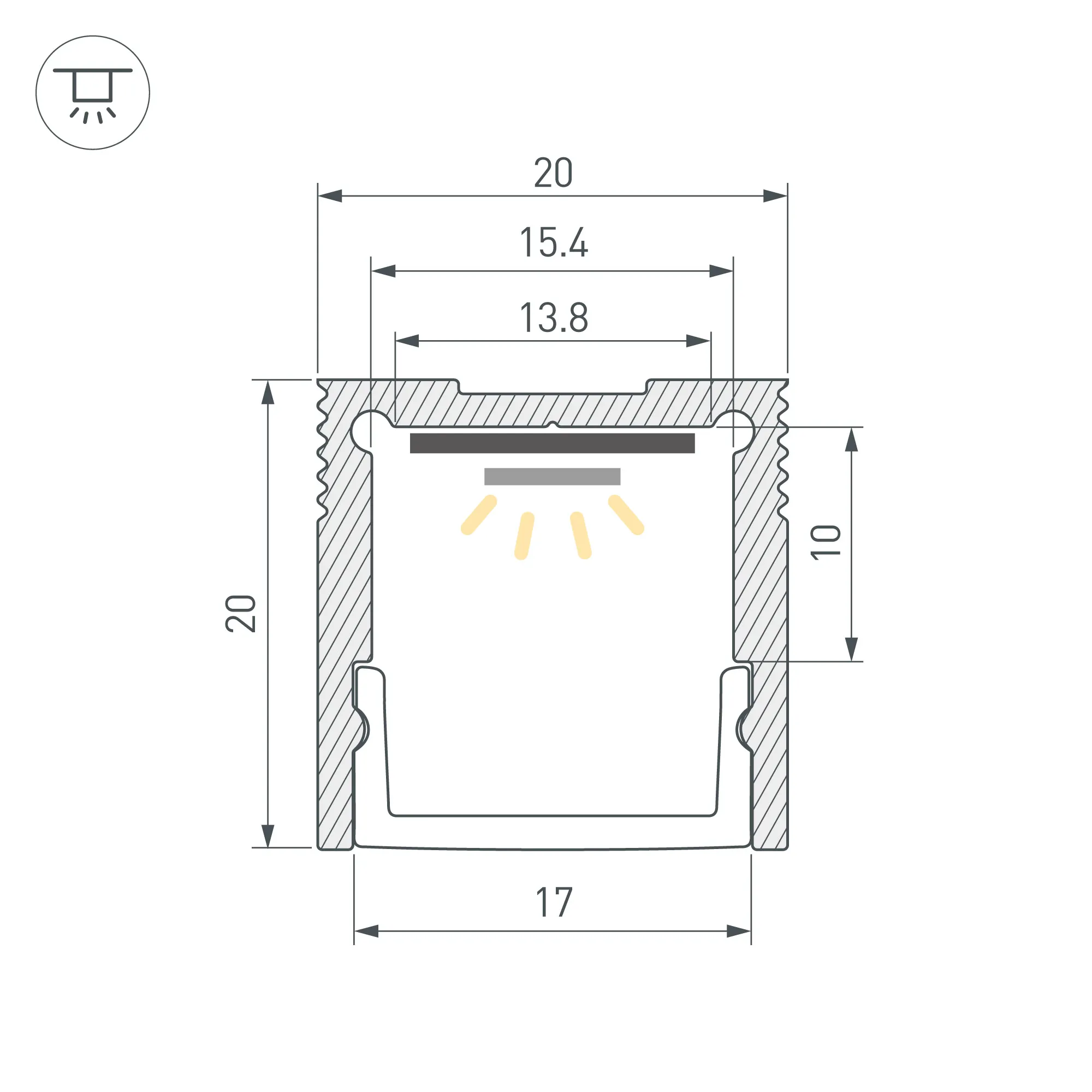 Алюминиевый профиль для светодиодных лент и линеек. Цвет - белый RAL9003 (порошковая окраска). Габаритные размеры (L×W×H): 2000x20x20 мм. Ширина площадки для ленты 15 мм. Экраны, заглушки и другие аксессуары приобретаются отдельно. Цена за 1 метр.