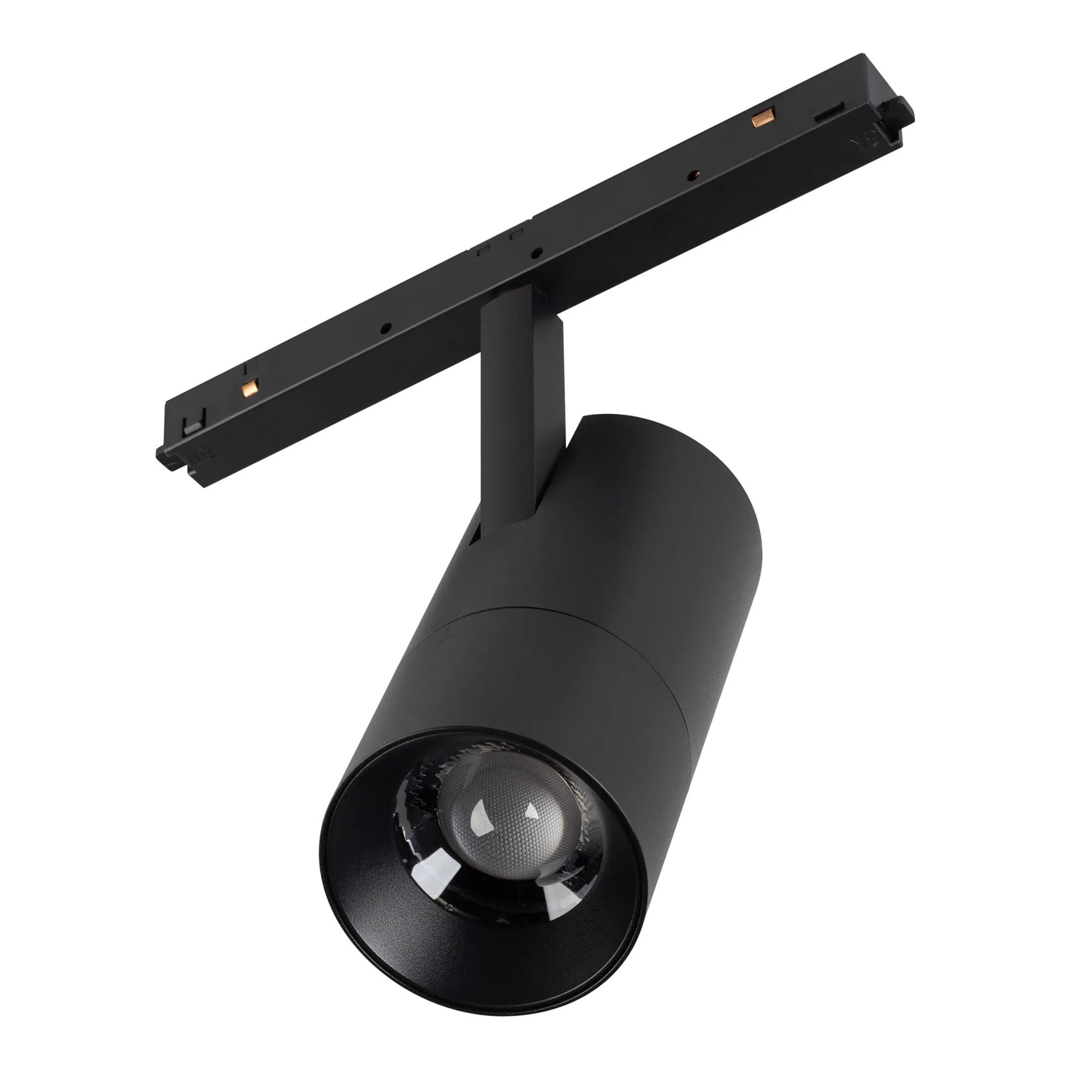 Светильник для магнитных треков MAG-ORIENT шириной 26 мм, с управлением по DALI. Мощность 15 Вт, св. поток 1100 лм, 73 лм/Вт, теплый 3000 K, CRI>94, угол 34-60°, напряжение питания 48 В. Черный фигурный корпус из металл, экран поликарбонат, степень защиты IP20. Размеры LxWxH 204x66x211 мм.