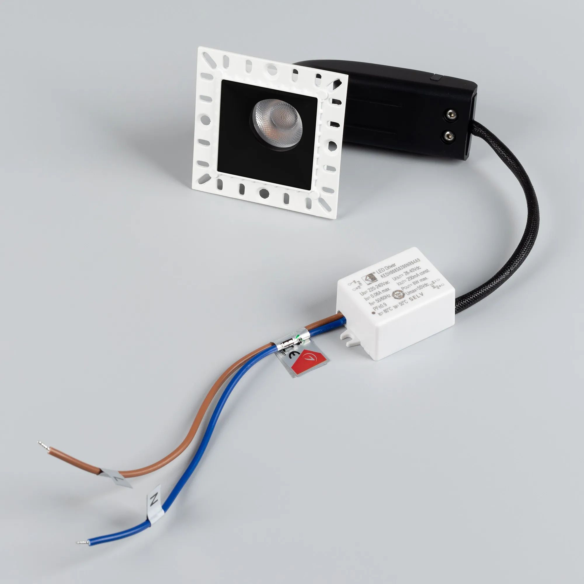 Встраиваемый безрамочный светильник под шпаклевку. Мощность 9 Вт, св. поток 640 лм, 71 лм/Вт, тёплый 3000 K, CRI>90, угол 36°, напряжение питания 230 В. Чёрный квадратный корпус, экран PMMA, степень защиты IP20. Размер: длина 65 мм, ширина 65 мм, высота 63 мм, размер отражателя 40x40 мм. Монтаж встраиваемый, установочное отверстие длина 45 мм, ширина 45 мм. Драйвер 26-40 В, 200 мА, пульсация <2%.